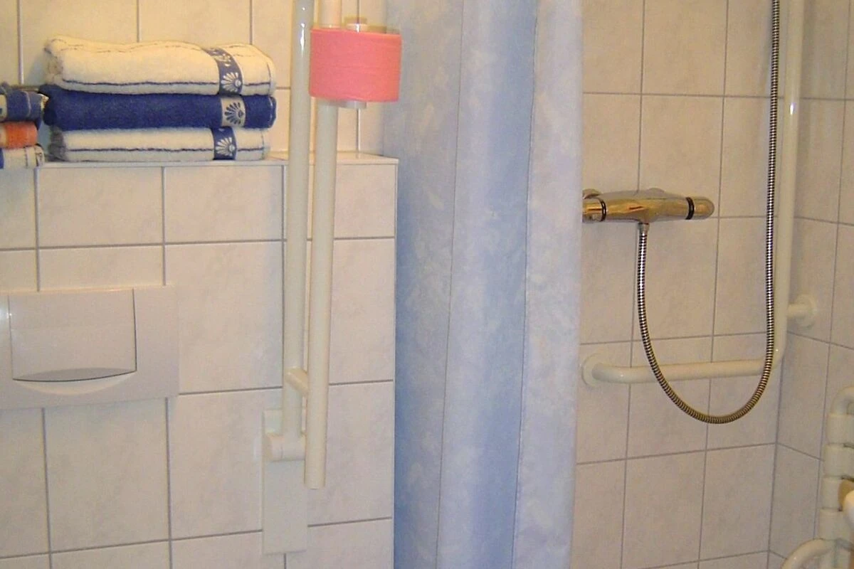 • Das Badezimmer verfügt über eine Dusche, WC und Fön