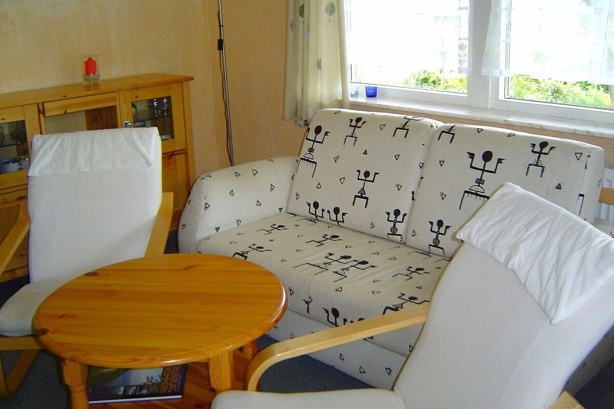 • Der Wohnraum ist ausgestattet mit einer Sitzgruppe, Radio und TV