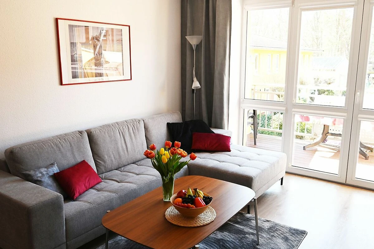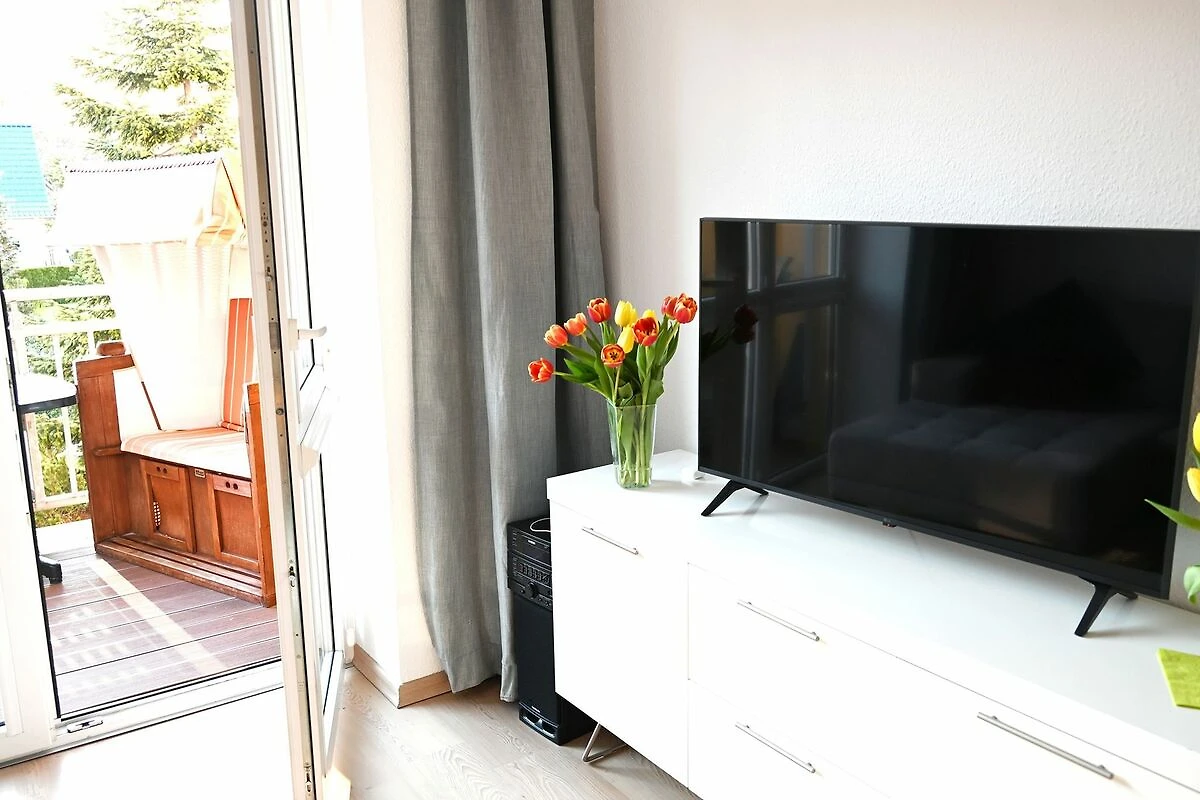 Die Ferienwohnung Am Strand verfügt über zwei Etagen und ist mit einer Grösse von 79m² sehr geräumig. Sie wurde in gehobenem Standard 2012 komfortabel eingerichtet und wird ganzjährig für max. 4 Personen vermietet. Die Ferienwohnung lädt mit ihrem gemütlichen Ambiente und ihren zwei Balkonen zum Wohlfühlen ein. Auf dem Ostbalkon lässt sich die Morgensonne geniessen. Auf dem grossen Balkon nach Südwesten kann man im Strandkorb den Alltagsstress abschalten und gemütlich zu Abend essen. Für Familien mit Kindern sind innerhalb der Ferienanlage auf dem grossen Grundstück ein schöner Spielplatz und ein Grillplatz vorhanden.