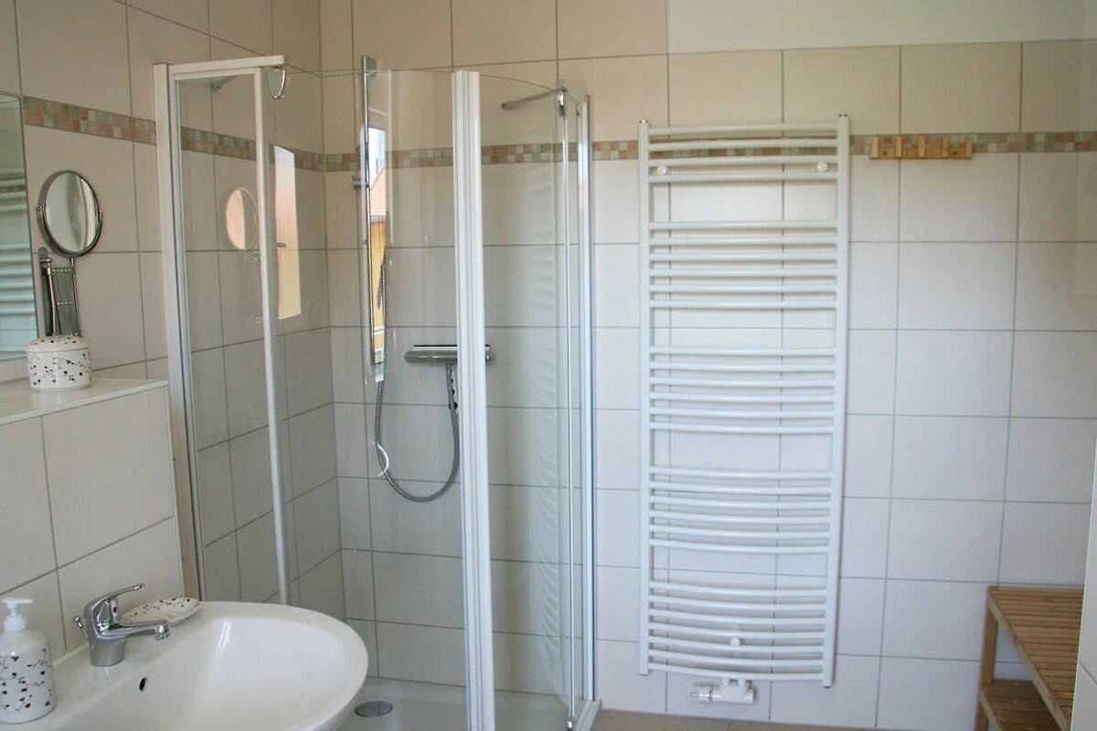 Die Ferienwohnung Am Strand liegt ruhig am Ende der Strasse und erstreckt sich über 2 Etagen. Im 1.OG befinden sich das Wohnzimmer mit Flachbild TV & Radio, ein grosser Balkon, ein geräumiges Bad mit Fenster, Dusche, WC und Fön. Die offene Einbauküche ist mit Cerankochfeld, Backofen, Kühlschrank, Tiefkühlfach, Mikrowelle mit Grill, ausreichend Besteck, Gläsern und Geschirr ausgestattet. In der oberen Etage befinden sich zwei Schlafzimmer und ein zweites Bad mit Dusche und WC sowie ein weiterer Balkon. In der kalten Jahreszeit sorgt die Fussbodenheizung für behagliche Wärme.