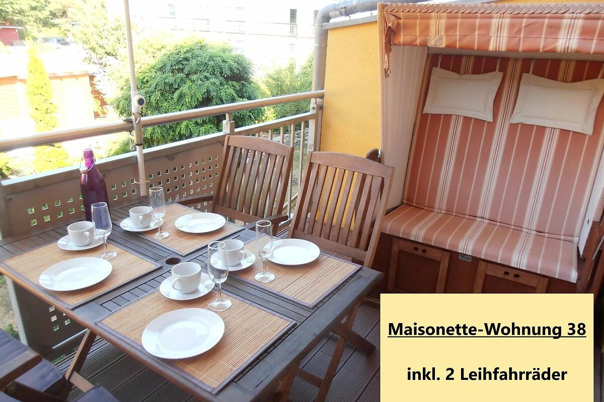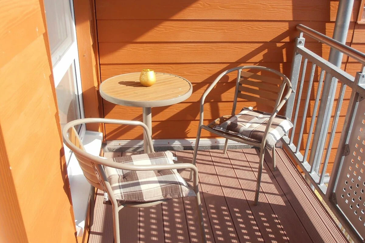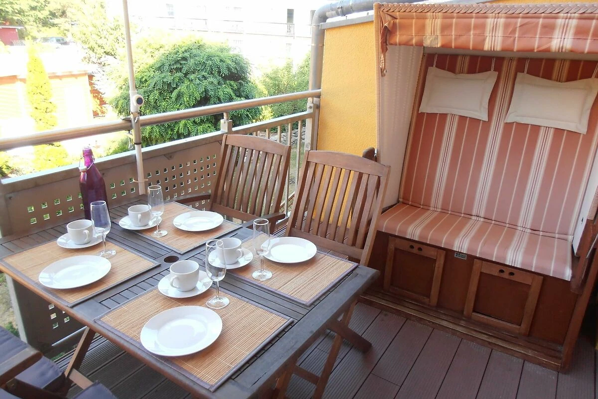 1 Balkon mit Gartenmöbeln & Strandkorb