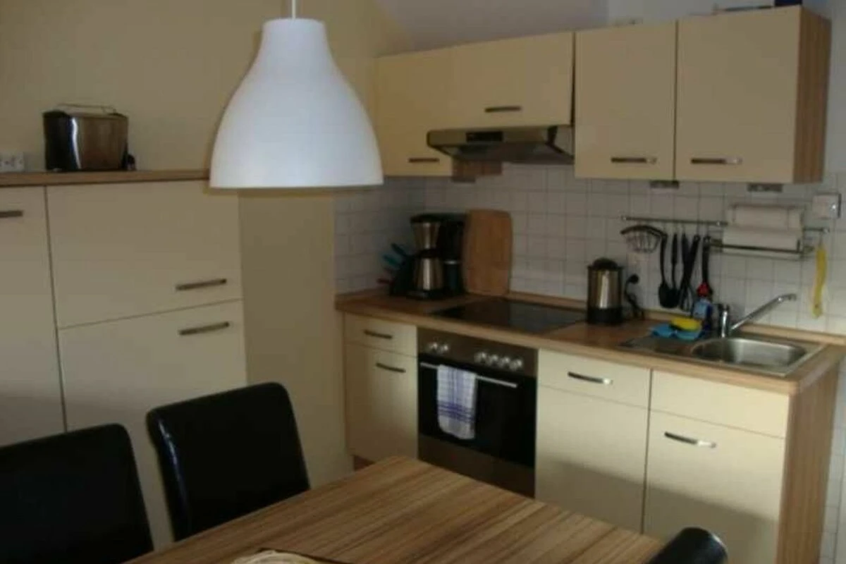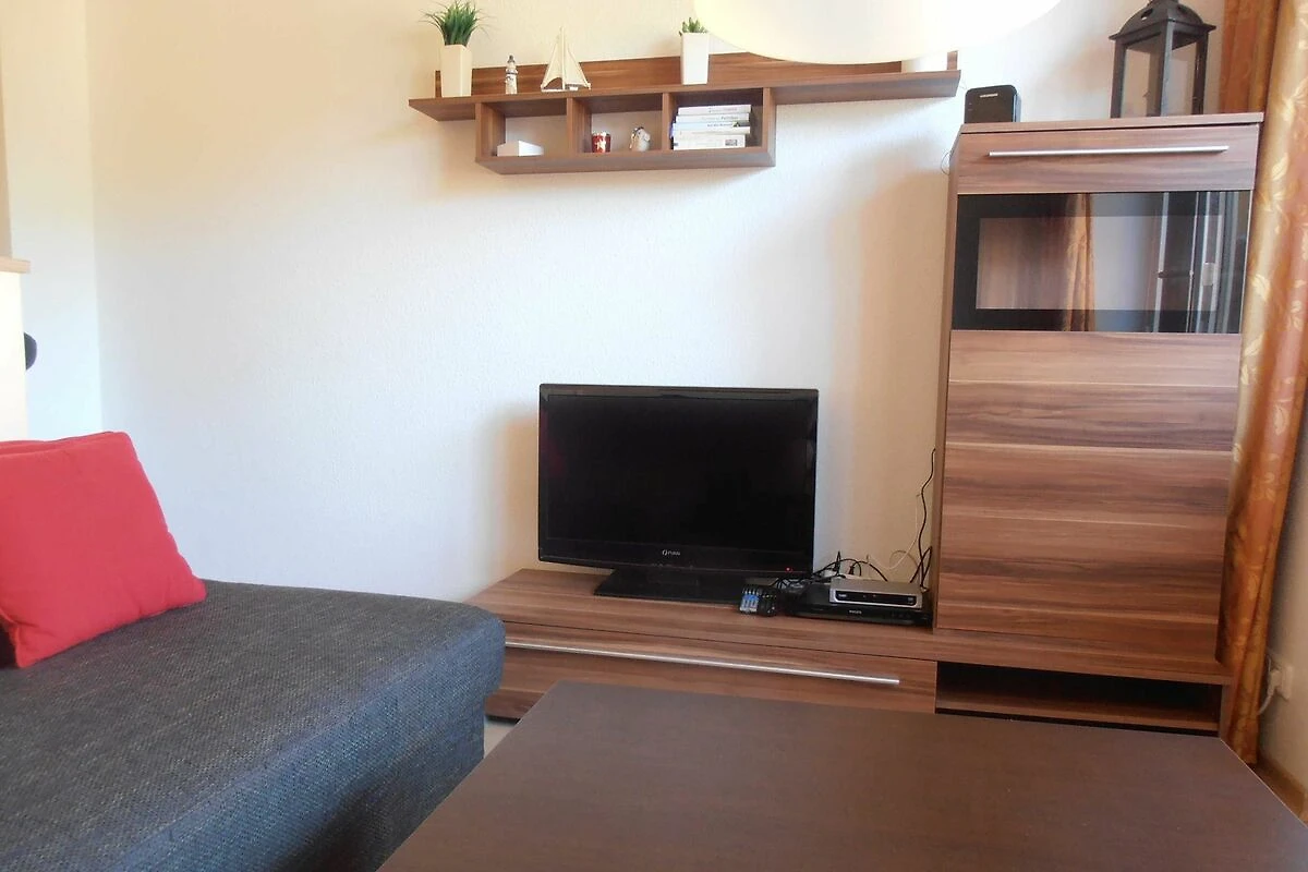 Im 1.OG befindet sich das Wohnzimmer mit offener Küche, ein schöner süd/west ausgerichteter Balkon und ein Bad mit Dusche, WC und Fön. Die offene Einbauküche ist mit einem Ceranherd, Backofen, Kühlschrank, Mikrowelle, Tiefkühlfach, Gläser, Besteck und Geschirr ausgestattet.
