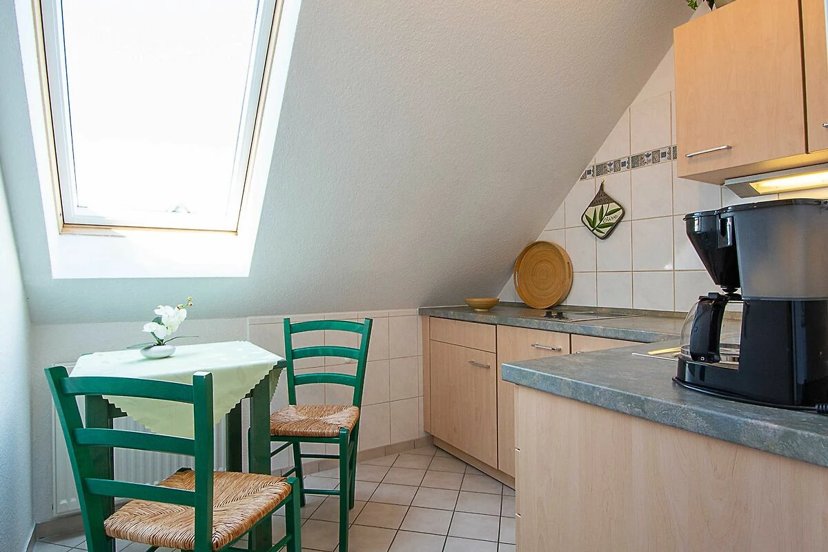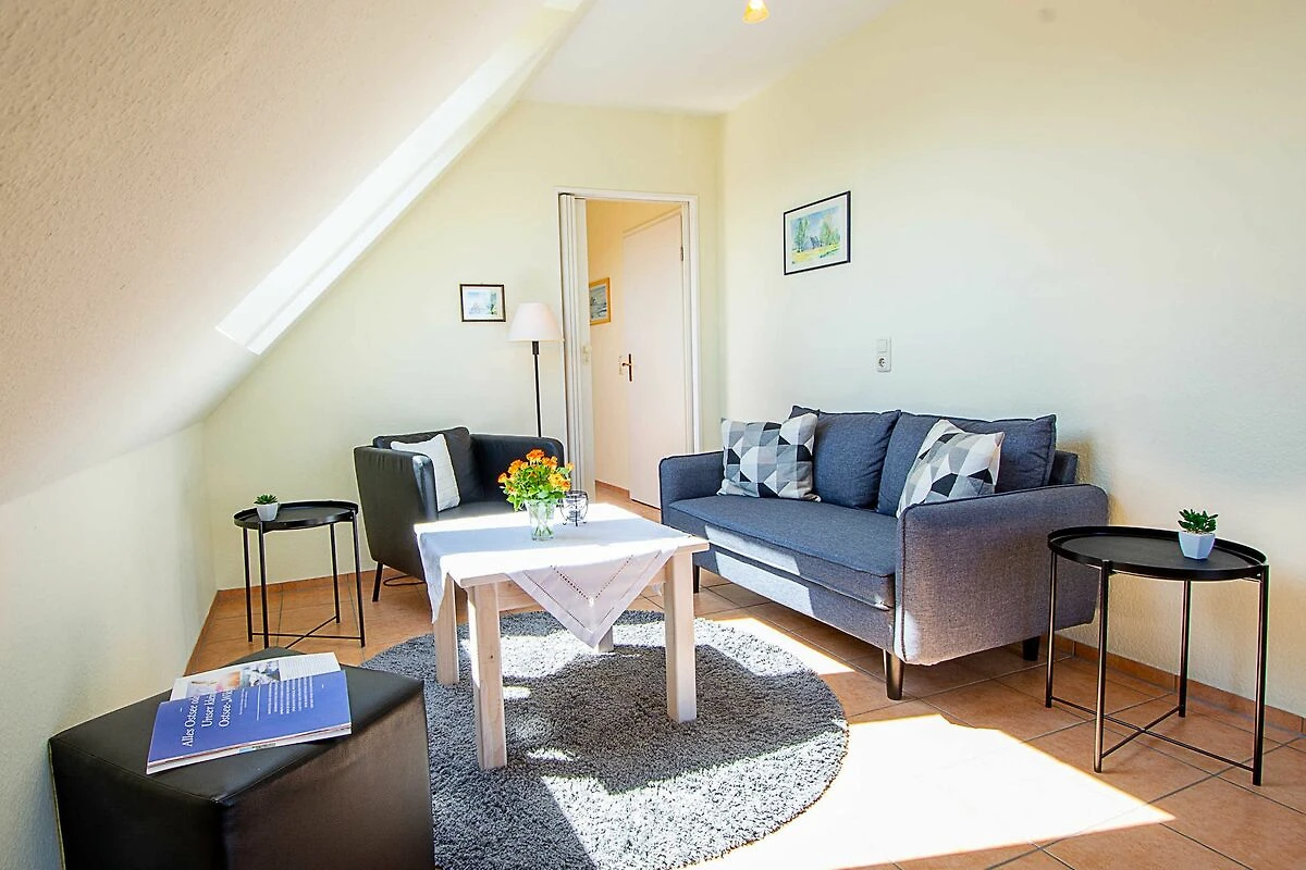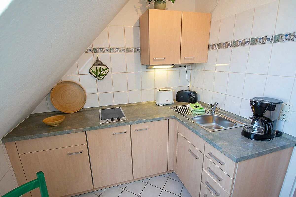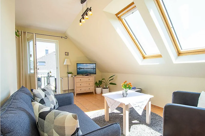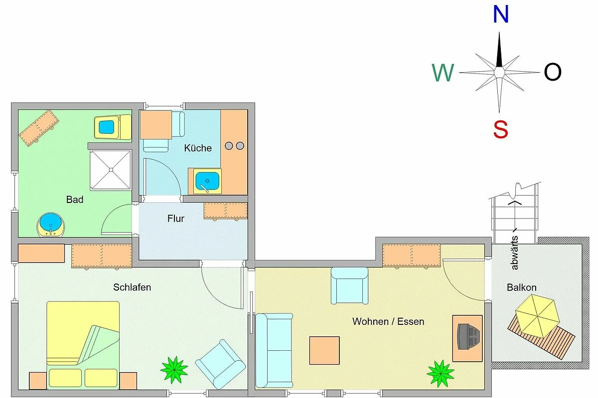 Sie wohnen in einer gemütlich und modern eingerichteten Komfortferienwohnung mit Balkon im Obergeschoss eines Familienhauses. Das helle freundliche Wohnzimmer ist ausgestattet mit einer gemütlichen Couchgarnitur, Sessel, Tisch und Flachbild-TV. Von hier betreten Sie das Schlafzimmer, welches mit einem Doppelbett und einem geräumigen Kleiderschrank ausgestattet ist. Vom Schlafraum betreten Sie über einen kleinen Flur die kleine Küche.und das Bad. In der Küche mit Esstisch und 2 Stühlen befindet sich ein Kühlschrank, ein 2-Platten-Kochfeld, Wasserkocher, Toaster, eine Kaffeemaschine sowie alle wichtigen Küchenutensilien, die Sie für Ihr 2perfektes Dinner benötigen. Das geflieste Tageslichtbad mit Dusche und WC ist grosszügig gestaltet und bietet genügend Platz für Ihre Badutensilien.