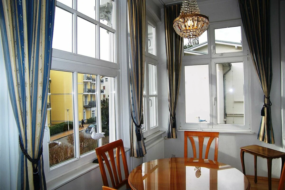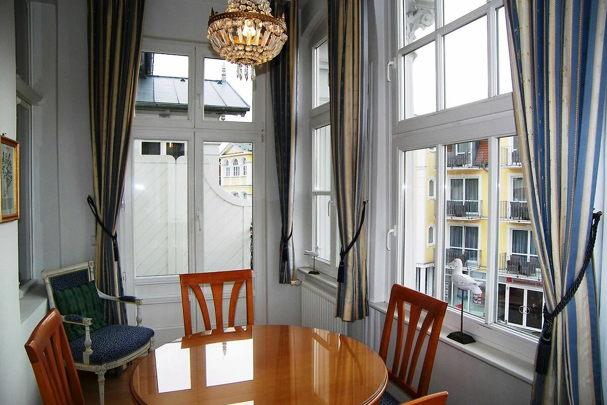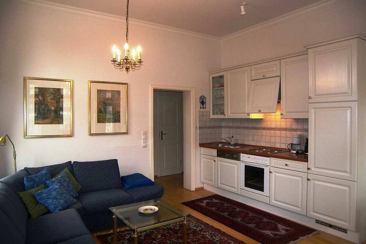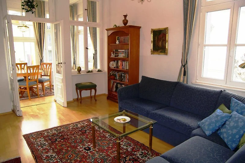 Die Wohnung ist exklusiv mit Stilmöbeln in Kirschbaum und Mahagoni, hochwertigem Bucheparkett, Stuckdecken und Kassettentüren eingerichtet. Der stillvolle Wohnbereich ist mit einer Couch, Flachbild-TV und DVD-Player sowie einer Stereo-Anlage eingericht. Die offene Einbauküche ist mit Backofen, Spülmaschine, Kühlschrank mit Gefrierfach, Kaffeemaschine, Wasserkocher und Toaster ausgestattet. An den Wohnbereich schliesst sich die helle Veranda mit Esstisch an. Das erste der beiden Schlafzimmer ist mit einem Doppelbett ausgestattet, das zweite mit zwei Einzelbetten. Im hochwertigen Bad mit Glasdusche müssen sie ausserdem auf Haartrockner und Schminkspiegel nicht verzichten. Die Wohnung besitzt einen sonnigen Balkon mit entsprechenden Möbeln. W-LAN steht Ihnen kostenfrei zur Verfügung.