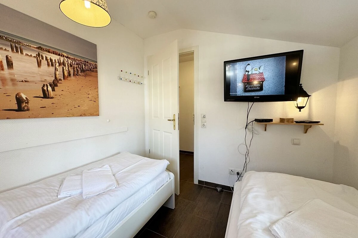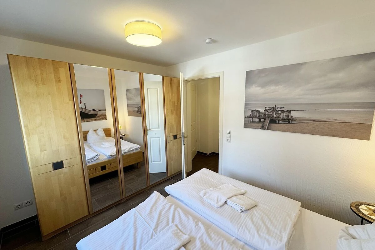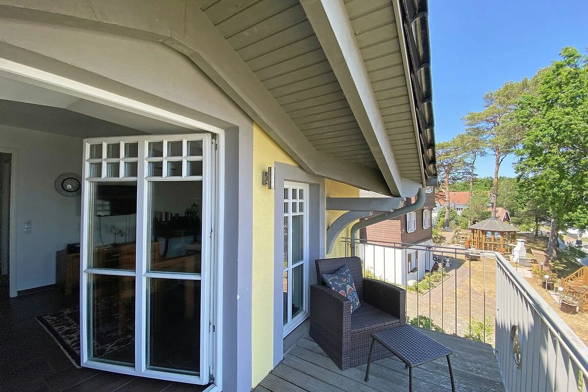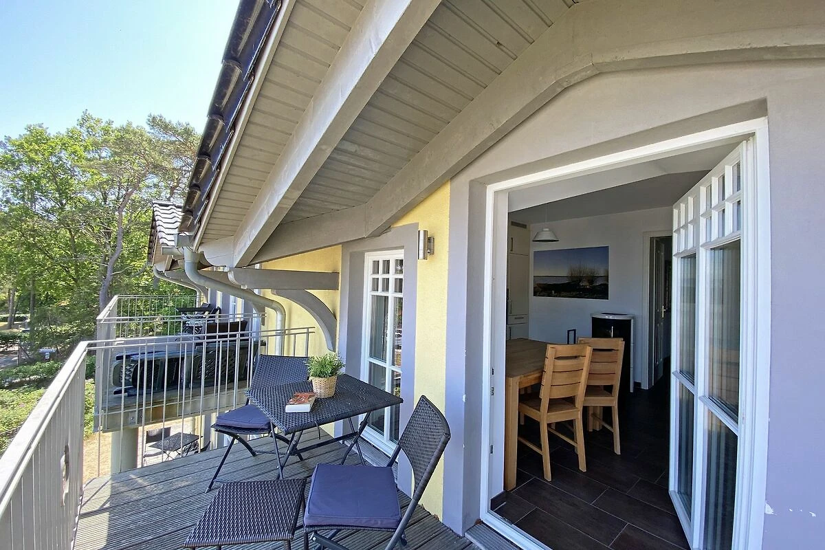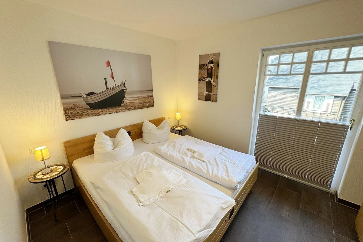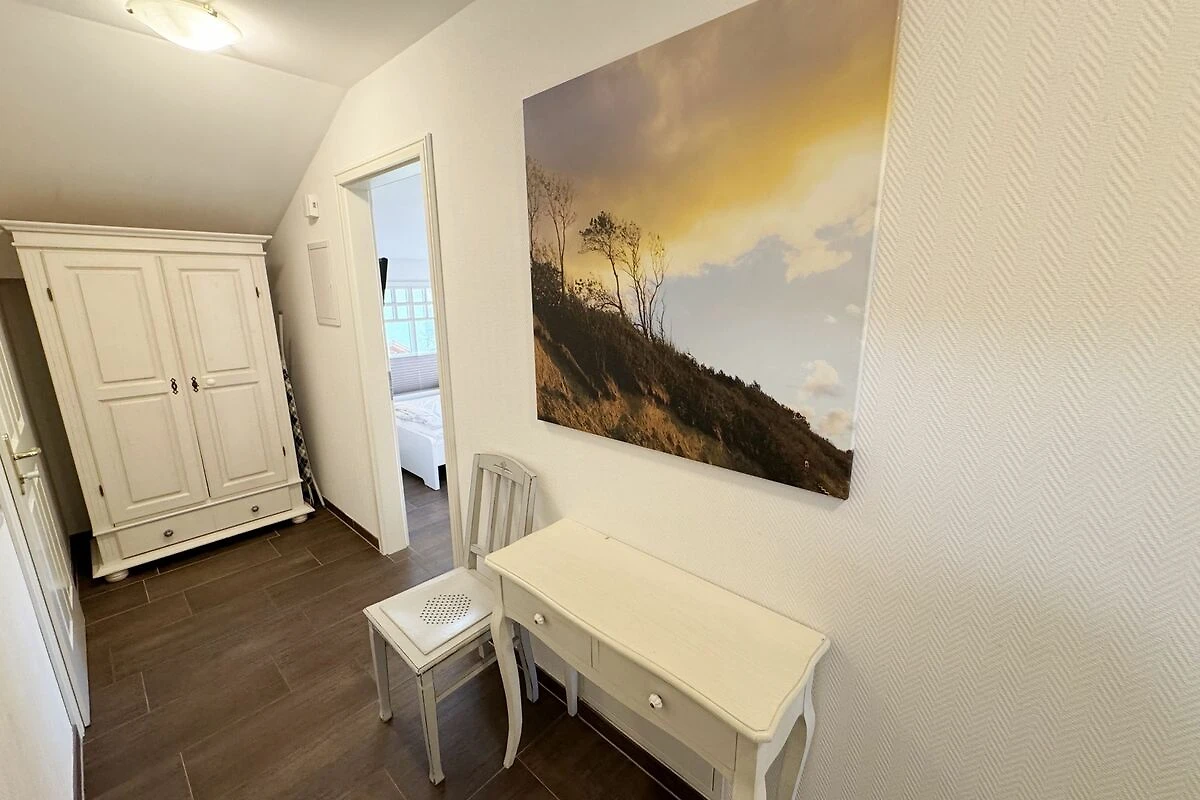 Die modern eingerichtete Nichtraucherferienwohnung 03 im Haus Strandkiefer befindet sich in der 1. Etage. Sie bietet Ihnen mit ca. 56 m² ausreichend Platz für 2 bis 4 Personen + 1 Kleinkind bis 3 Jahre im Kinderreisebett. Vom Flur mit Garderobe gelangen sie in alle Räumlichkeiten. Der helle Wohn-/Essbereich besticht mit seinen bodentiefen Holzfenstern und den Blick auf die Ostsee. Der Wohnbereich wurde mit einer Couch, einem Couchtisch, einem Sessel, einem TV-Board mit einem Smart-TV, einem WLAN-Zugang und einem Blu-Ray-Player ausgestattet. Abgerundet wird der Raum durch einen Kamin, der Ihnen gerade in der kälteren Jahreszeit, zusätzlich zur Fussbodenheizung, eine wohlige Wärme beschert. Die angrenzende Küchenzeile lässt keine Wünsche offen, so dass Sie mit einem Geschirrspüler, einem Backofen (selbstreinigend), einem Kühlschrank mit Gefrierfach, einem Cerankochfeld, einer Mikrowelle, einer Kaffeemaschine, einem Toaster, einem Wasserkocher, einem Mixer sowie diversen Küchenutensilien jede Mahlzeit zubereiten können. Zusätzlich finden Sie hier auch eine Waschmaschine mit Trocknerfunktion. Durch den Essplatz am Fenster wird der Bereich komplettiert. Ihr bestuhlter Balkon (Ost) erreichen Sie vom Wohnbereich, von wo Sie auch den Blick auf das Meer geniessen können. Das grosse Schlafzimmer verfügt über ein Doppelbett (1,80m x 2,00m), verstellbare Lattenroste, Nachttischablagen mit Beleuchtung, einem grossen Kleiderschrank und Verdunklungsplissees. Zusätzlich haben Sie auch von hier eine Möglichkeit auf einen weiteren Balkon (Nord) zu kommen. Das kleine Schlafzimmer verfügt über 2 Einzelbetten (0,90m x 2,00m), Nachttischablagen mit Beleuchtung, einem Flachbild-TV und Verdunklungsplissees. Das innenliegende Badezimmer ist mit einer Dusche (flacher Einstieg), einem WC, einem Waschtisch, einem Kosmetikspiegel, einem Fön und einer Badewanne ausgestattet. Ein Wäscheständer sowie Reinigungsutensilien runden die Ausstattung ab. Ihre mitgebrachten oder geliehenen Fahrräder können Sie im kleinen abschliessbaren Fahrradschuppen neben dem Hauseingang unterbringen. Ihr PKW-Stellplatz (Nr.03) befindet sich direkt am Haus. 2 Haustiere sind gegen eine Gebühr gern gesehene Gäste. Die Erstausstattung eines Wäschepaketes (komplette Bettwäsche, 1 Duschhandtuch, 1 kleines Handtuch) können Sie bis 14 Tage vor Anreise gegen einen Aufpreis dazu buchen oder durch eigenes Ergänzen. Ab 2 gebuchten Paketen erhalten Sie einmalig 1 Geschirrhandtuch und 1 Duschvorleger hinzu.