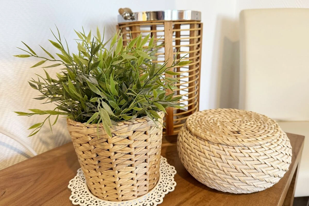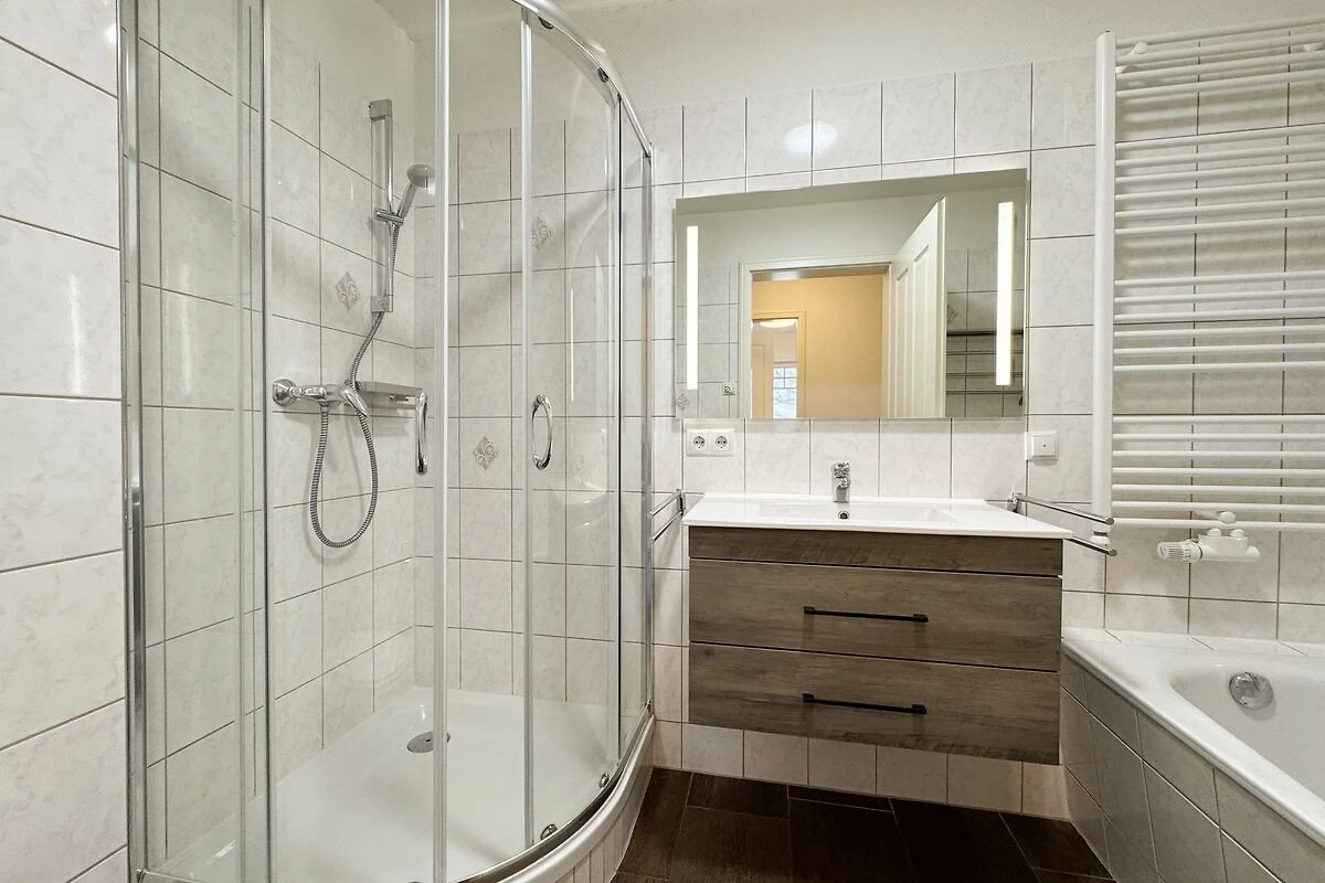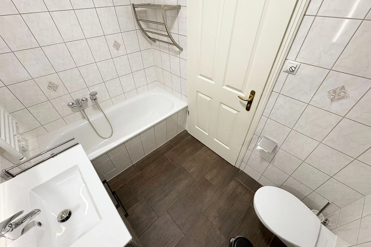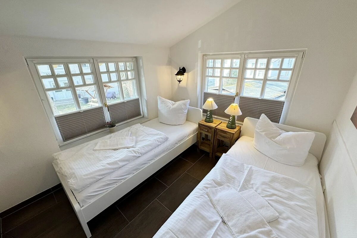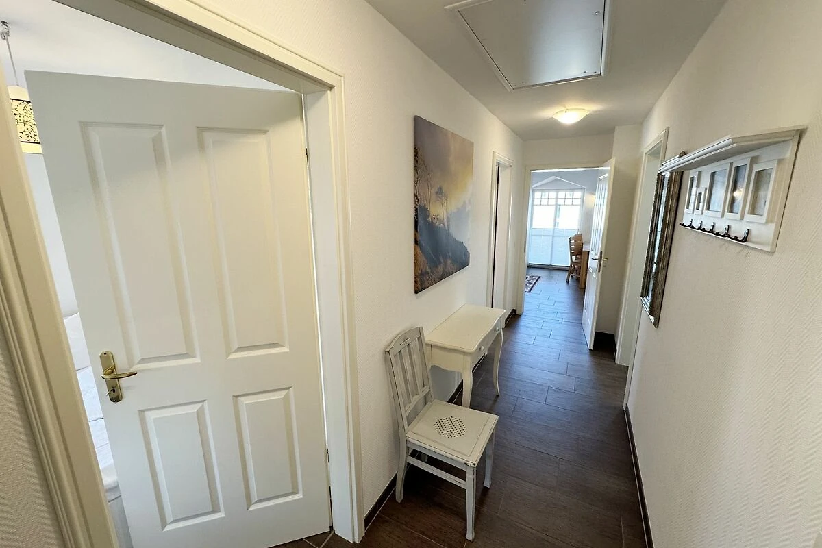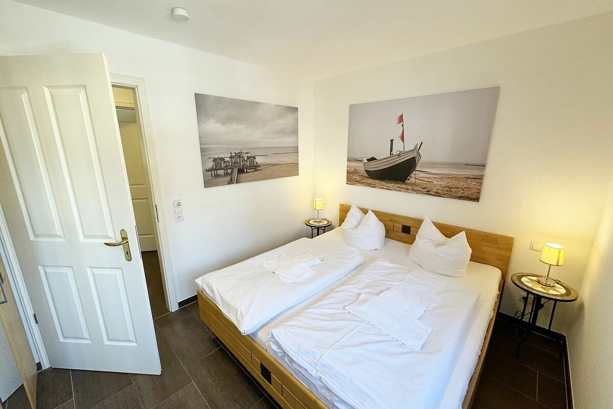 Die modern eingerichtete Nichtraucherferienwohnung 03 im Haus Strandkiefer befindet sich in der 1. Etage. Sie bietet Ihnen mit ca. 56 m² ausreichend Platz für 2 bis 4 Personen + 1 Kleinkind bis 3 Jahre im Kinderreisebett. Vom Flur mit Garderobe gelangen sie in alle Räumlichkeiten. Der helle Wohn-/Essbereich besticht mit seinen bodentiefen Holzfenstern und den Blick auf die Ostsee. Der Wohnbereich wurde mit einer Couch, einem Couchtisch, einem Sessel, einem TV-Board mit einem Smart-TV, einem WLAN-Zugang und einem Blu-Ray-Player ausgestattet. Abgerundet wird der Raum durch einen Kamin, der Ihnen gerade in der kälteren Jahreszeit, zusätzlich zur Fussbodenheizung, eine wohlige Wärme beschert. Die angrenzende Küchenzeile lässt keine Wünsche offen, so dass Sie mit einem Geschirrspüler, einem Backofen (selbstreinigend), einem Kühlschrank mit Gefrierfach, einem Cerankochfeld, einer Mikrowelle, einer Kaffeemaschine, einem Toaster, einem Wasserkocher, einem Mixer sowie diversen Küchenutensilien jede Mahlzeit zubereiten können. Zusätzlich finden Sie hier auch eine Waschmaschine mit Trocknerfunktion. Durch den Essplatz am Fenster wird der Bereich komplettiert. Ihr bestuhlter Balkon (Ost) erreichen Sie vom Wohnbereich, von wo Sie auch den Blick auf das Meer geniessen können. Das grosse Schlafzimmer verfügt über ein Doppelbett (1,80m x 2,00m), verstellbare Lattenroste, Nachttischablagen mit Beleuchtung, einem grossen Kleiderschrank und Verdunklungsplissees. Zusätzlich haben Sie auch von hier eine Möglichkeit auf einen weiteren Balkon (Nord) zu kommen. Das kleine Schlafzimmer verfügt über 2 Einzelbetten (0,90m x 2,00m), Nachttischablagen mit Beleuchtung, einem Flachbild-TV und Verdunklungsplissees. Das innenliegende Badezimmer ist mit einer Dusche (flacher Einstieg), einem WC, einem Waschtisch, einem Kosmetikspiegel, einem Fön und einer Badewanne ausgestattet. Ein Wäscheständer sowie Reinigungsutensilien runden die Ausstattung ab. Ihre mitgebrachten oder geliehenen Fahrräder können Sie im kleinen abschliessbaren Fahrradschuppen neben dem Hauseingang unterbringen. Ihr PKW-Stellplatz (Nr.03) befindet sich direkt am Haus. 2 Haustiere sind gegen eine Gebühr gern gesehene Gäste. Die Erstausstattung eines Wäschepaketes (komplette Bettwäsche, 1 Duschhandtuch, 1 kleines Handtuch) können Sie bis 14 Tage vor Anreise gegen einen Aufpreis dazu buchen oder durch eigenes Ergänzen. Ab 2 gebuchten Paketen erhalten Sie einmalig 1 Geschirrhandtuch und 1 Duschvorleger hinzu.