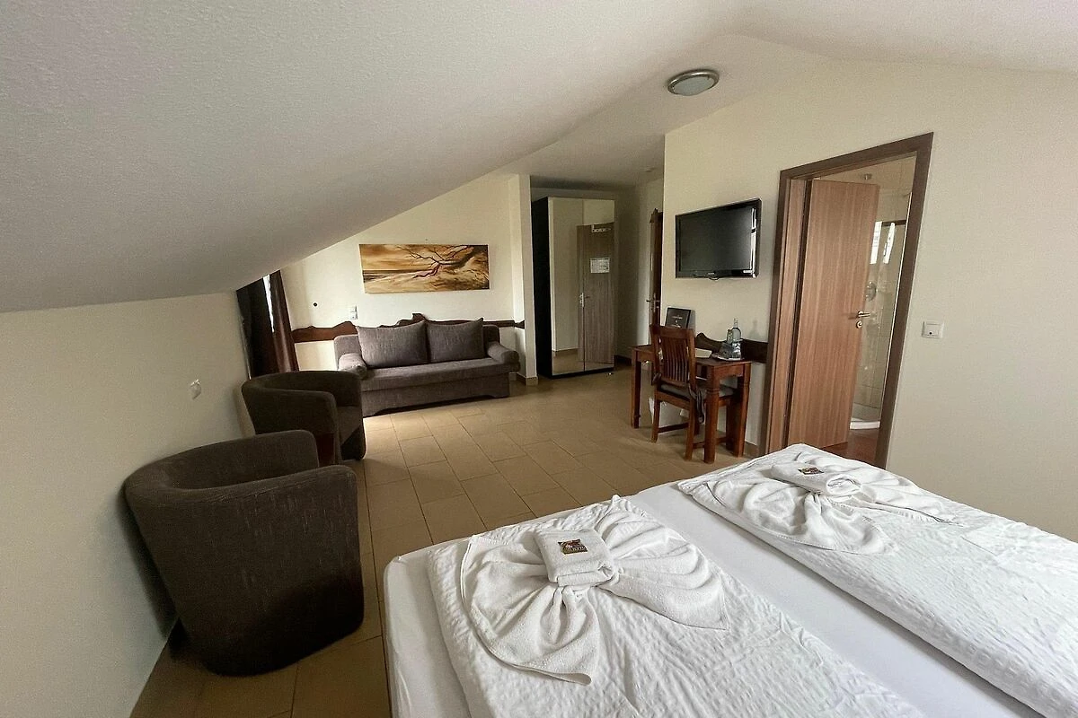 Eine Aufbettungsmöglichkeit ist in fast allen Zimmern auf einer Klappcouch (ein Meter vierzig) für eine erwachsene Person oder zwei Kinder (bis 11 Jahre) möglich.