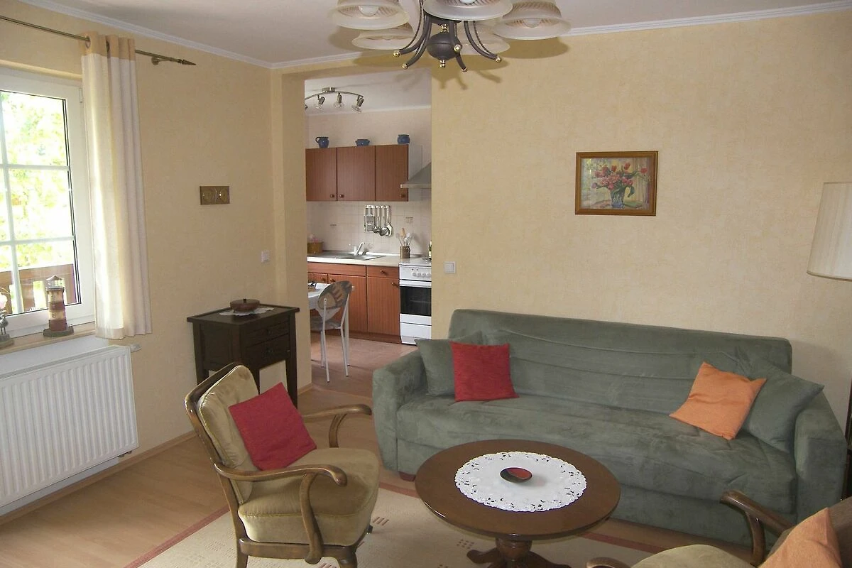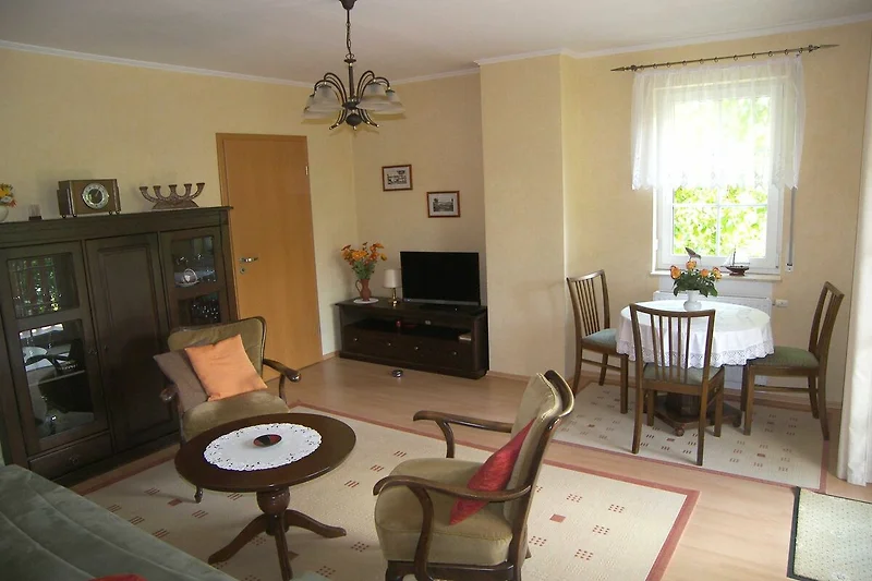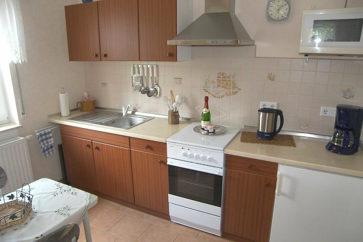 Die modern und gemütlich eingerichtete Nichtraucher-Ferienwohnung befindet sich im 1. Obergeschoss eines Wohnhauses. Die Ferienwohnung erreichen Sie über eine separate Aussen Treppe. Sie verfügt über ein grosses Wohnzimmer mit Couchsitzgruppe (Couch ist ausziehbar 140x200 für 1 Erw.), Esstisch mit 3 Stühlen, TV, Radio und CD-Player. Eine separate komfortable Küche mit 4-Platten-Herd mit Backofen, Mikrowelle u. Kühlschrank ist ebenfalls vorhanden. Die Wohnung verfügt über ein grosszügiges Schlafzimmer mit Doppelbett und Kleiderschrank. Das Tageslichtbad ist mit Dusche und WC ausgestattet. Vor dem Eingang ist ein möblierter Balkon mit einer Sitzgelegenheit für zwei Personen, weiterhin ist im Garten eine Sitzecke nutzbar und auch grillen ist möglich. Die Erstausstattung Bettwäsche und Handtücher, W-Lan und ein Parkplatz auf dem abgeschlossenen Grundstück sind im Preis inklusive. Haustiere sind nicht erlaubt. Auf Anfrage kann ein Kinderbett und ein Hochstuhl kostenfrei zur Verfügung gestellt werden. Es können beim Vermieter 3 Fahrräder kostenfrei ausgeliehen werden.