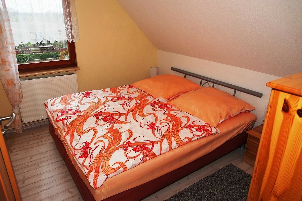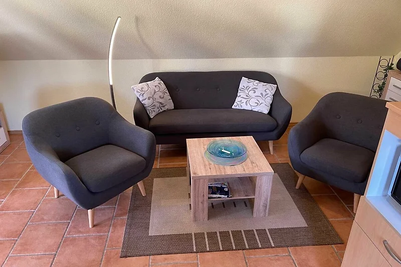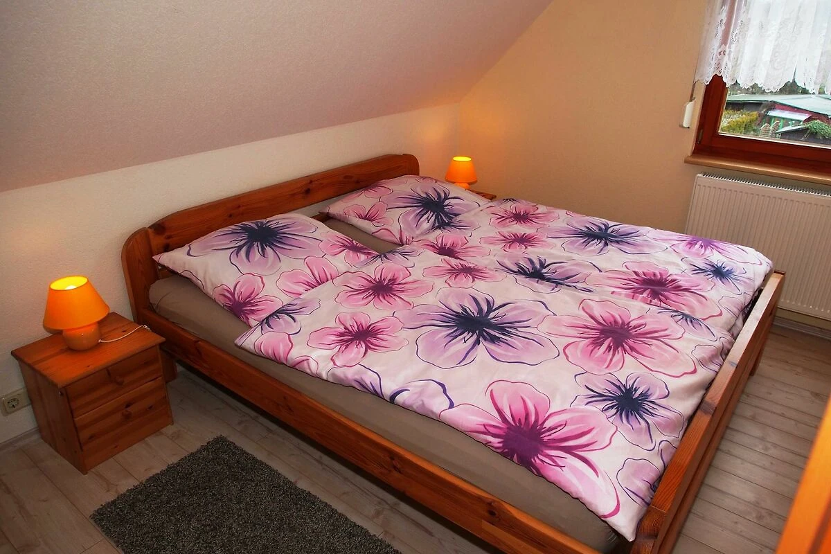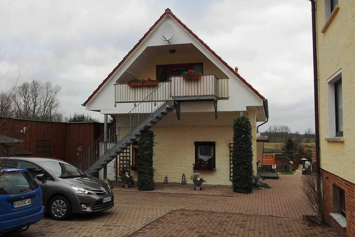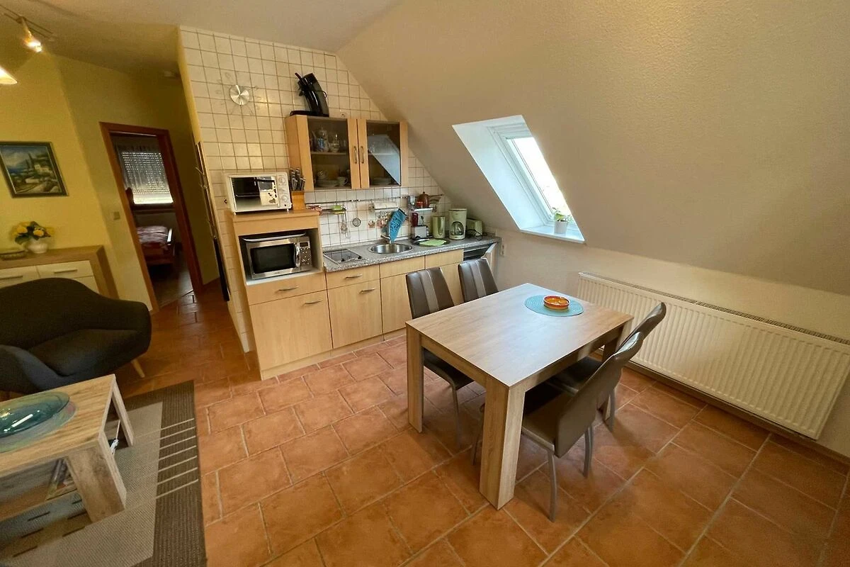 Die Ferienwohnung befindet sich im OG und ist über eine Aussentreppe und den Balkon zu erreichen. Sie besteht aus einem Wohnzimmer mit Sitzgruppe, TV, der Küchenzeile mit dem Esstisch, zwei separaten Schlafzimmern mit je Doppelbetten und dem Duschbad.