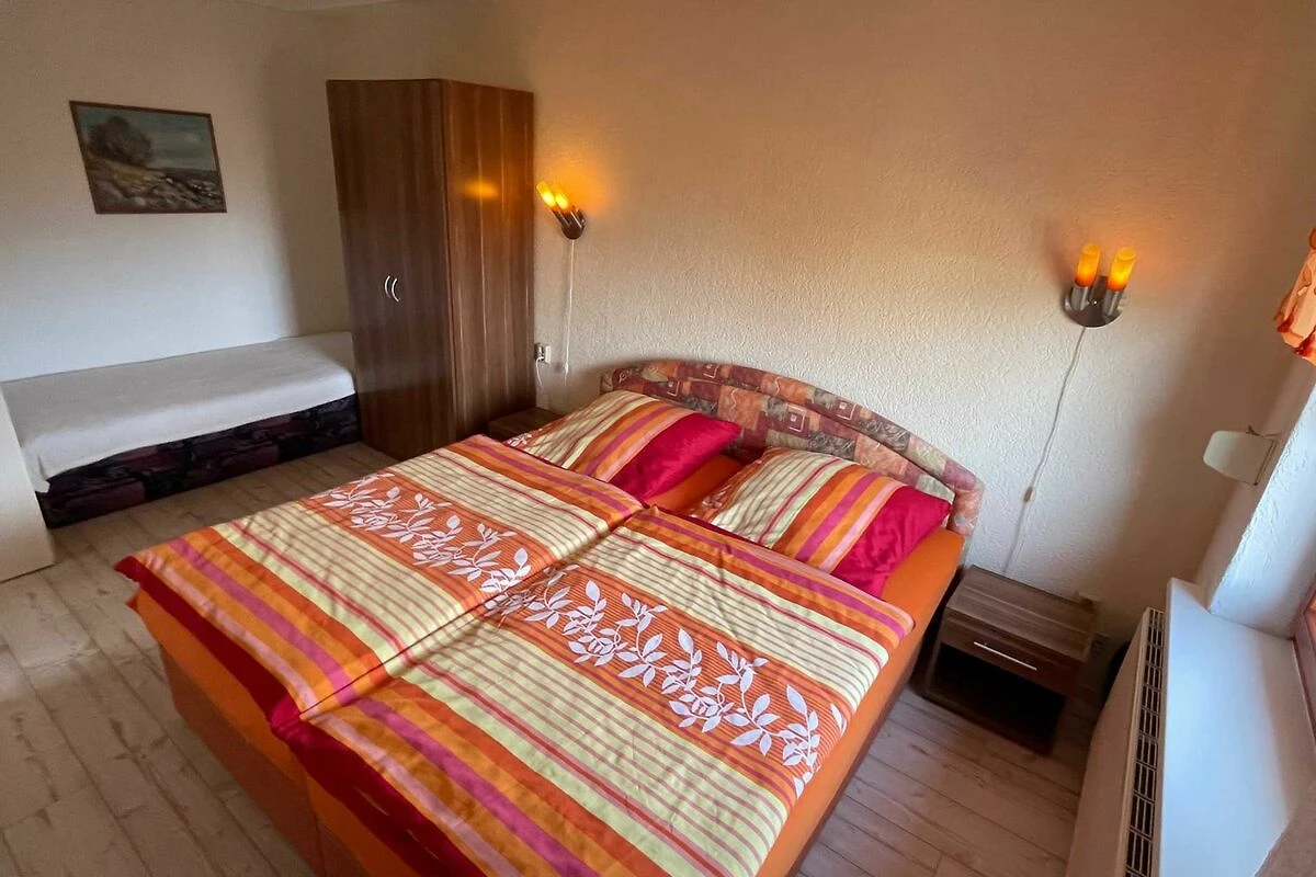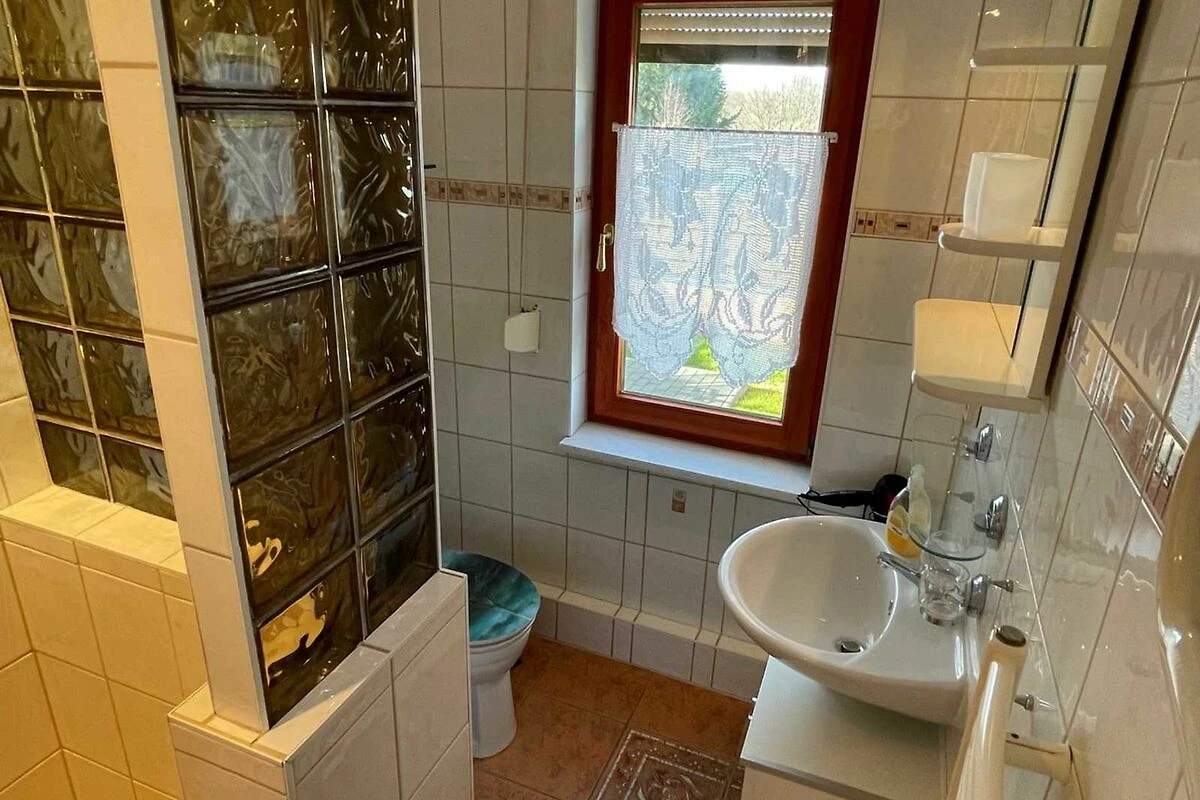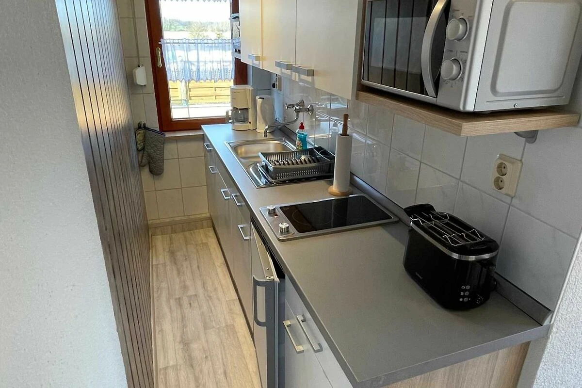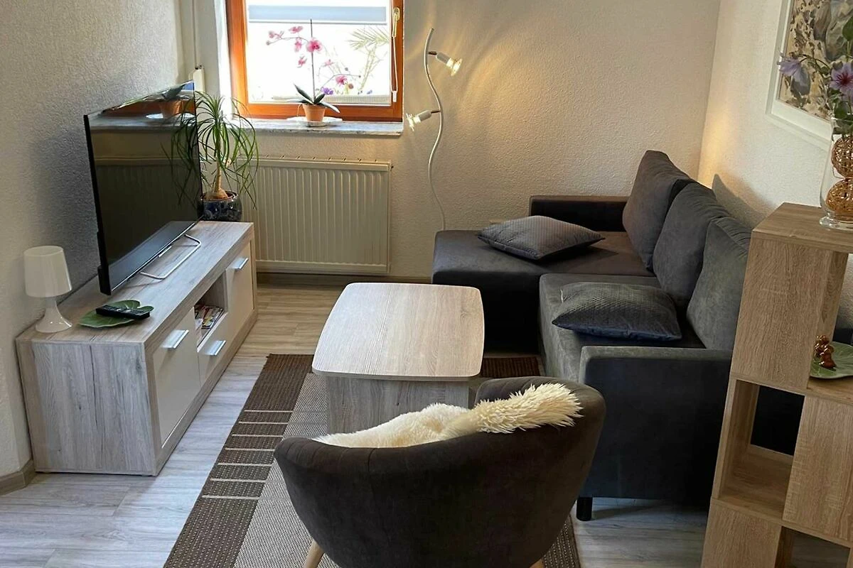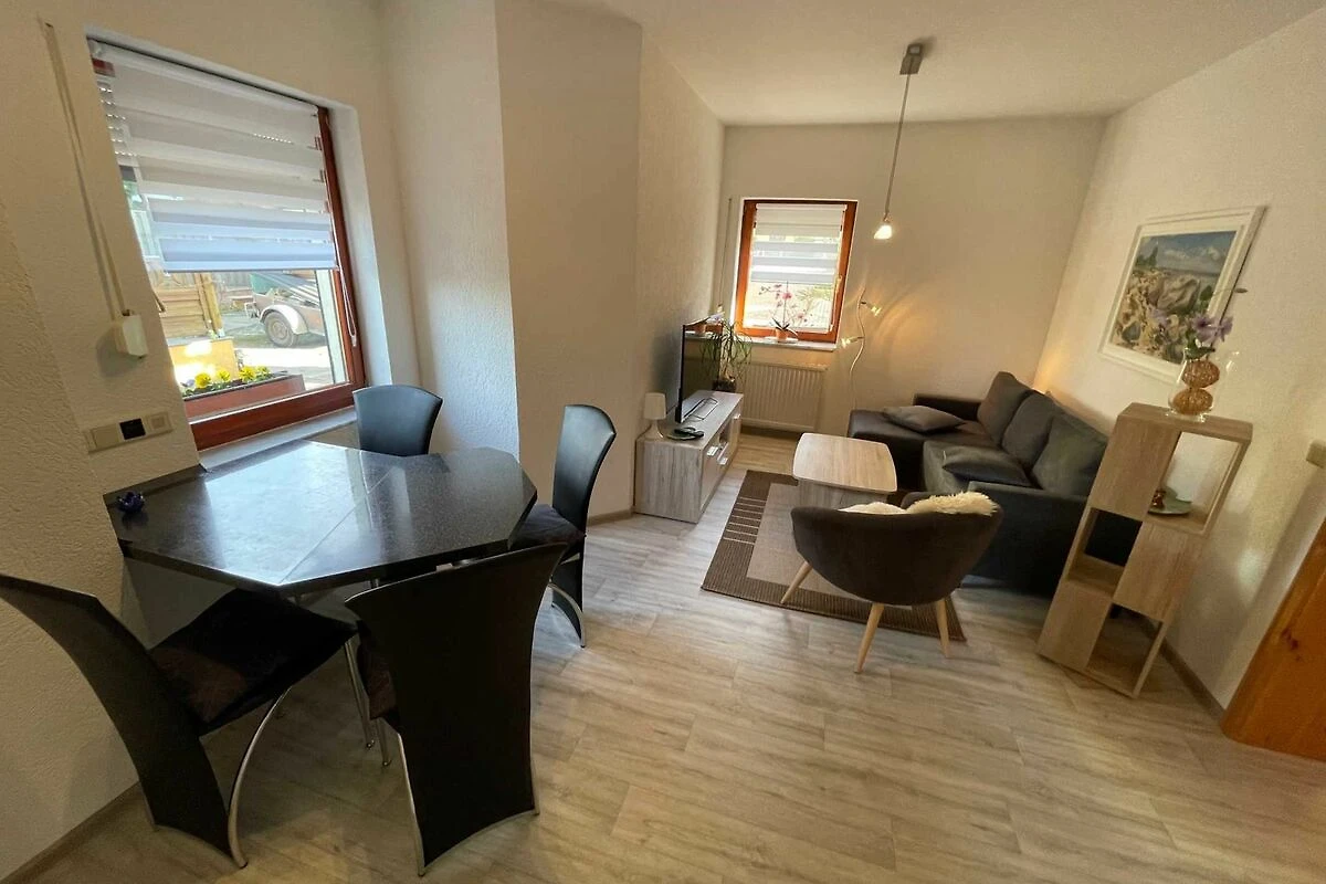 Die Ferienwohnung befindet sich im EG und hat einen sep. Eingang. Sie besteht aus einem Wohnzimmer mit Sitzgruppe, TV, der Küchenzeile mit dem Esstisch, zwei separaten Schlafzimmern mit Doppel bzw. Einzelbetten und dem Duschbad.