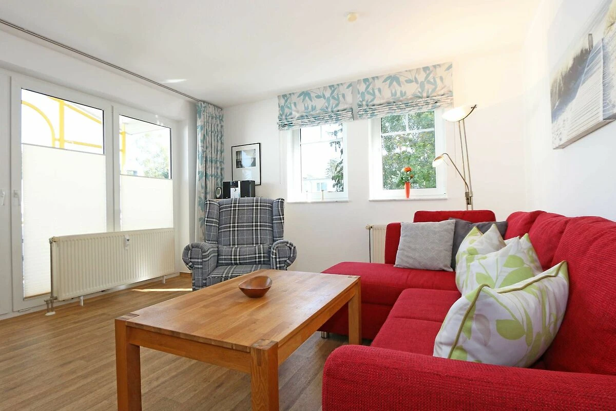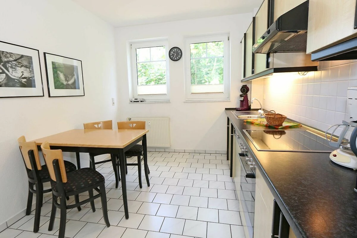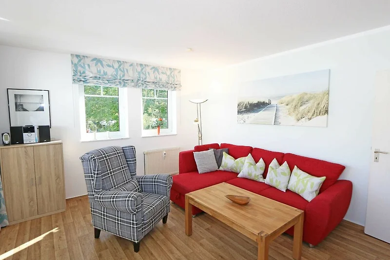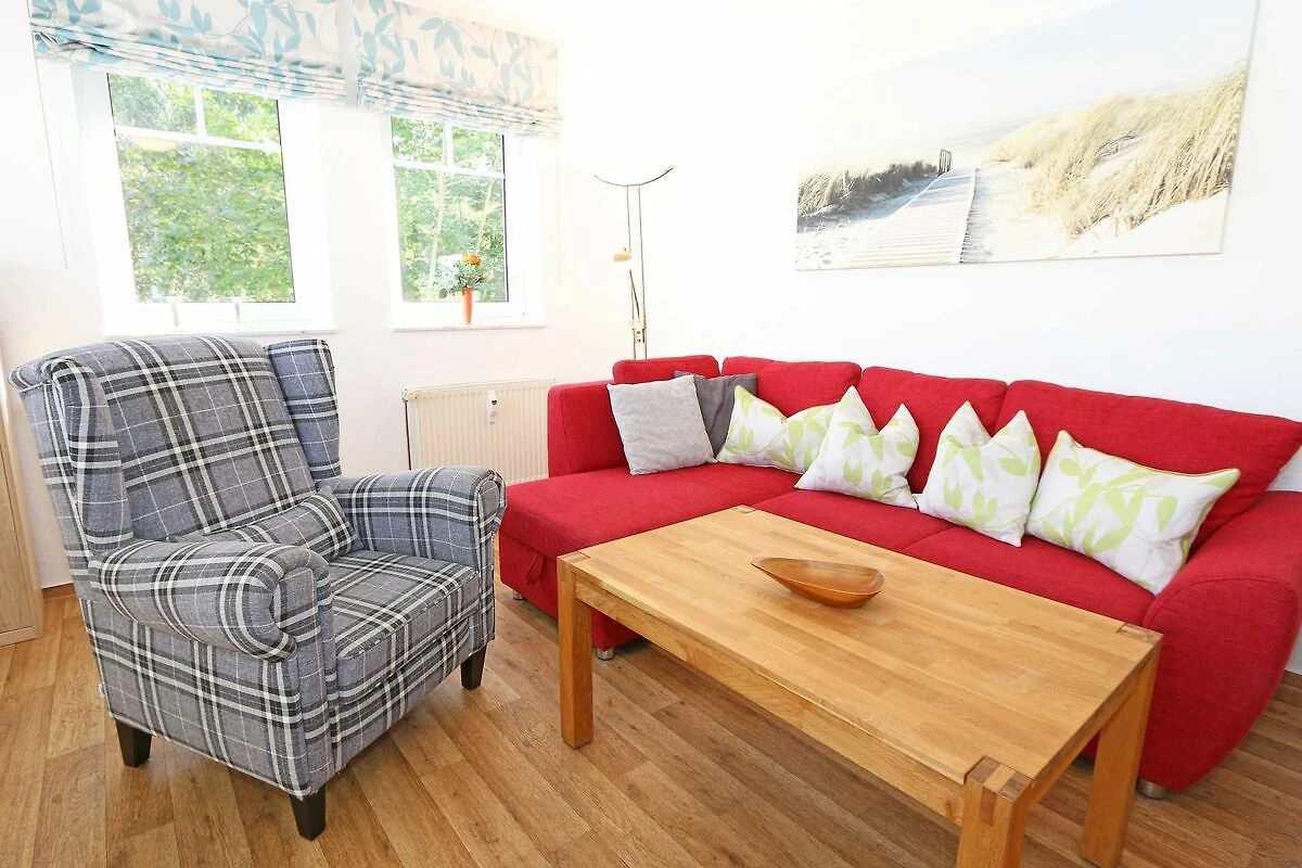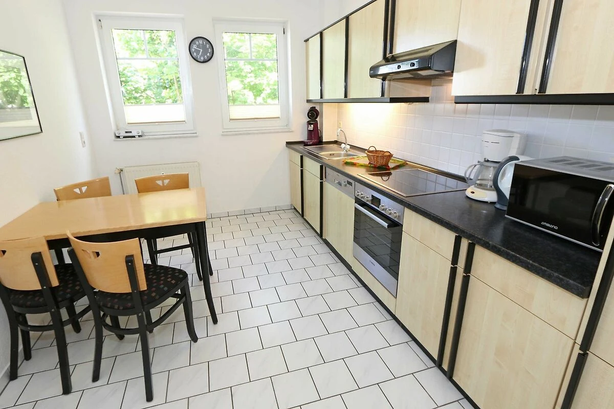 Die Ferienwohnung Nr. 05 (Nichtraucher) ist ca. 60 qm gross und befindet sich im Ostseebad Baabe, in einer ruhigen Seitenstrasse (300m zum Strand). Die Ferienwohnung (1. Etage) besteht aus einem Wohnzimmer mit einer Schlafcouch (2,10m x 2,15m), 2 Sessel, Leselampe, Smart-TV, DVD-Player, Mini-Stereo-Anlage mit DAB-Radio und einem Zugang zum Balkon. Die separate Küche ist komplett ausgestattet und verfügt über 4-Zonen-Ceranfeld, Backofen, Geschirrspüler, Kühlschrank, Kaffeemaschine, Mikrowelle, Senseo Padmaschine, Toaster, Eierkocher und diversen Küchenutensilien. Ein Esstisch und 4 Stühle sind natürlich in der Küche vorhanden. Das Schlafzimmer besteht aus einem Boxspringbett (1,80m x 2,00m), Kleiderschrank, Verdunklungsplissee´s sowie ein TV-Gerät. Das Bad verfügt über eine ebenerdige Dusche, ein WC, ein Kosmetikspiegel und Fön. Ein bestuhlter Balkon in der 1. Etage (Richtung Nord/Ost) lädt zum Verweilen ein. Insektenschutzgitter befinden sich in der Küche sowie im Schlafzimmer. Ein eigener PKW-Stellplatz Nr. 05 sowie ein Fahrradunterstand am Haus oder ein Gemeinschafts-Fahrradkeller sind vorhanden. Auch im Urlaub brauchen Sie in der Wohnung nicht auf einen Internetanschluss (W-LAN/LAN) zu verzichten. Dieser ist für Sie inklusive!!! Auch eine kleine Auswahl an Gesellschaftsspielen sowie Urlaubslektüre steht Ihnen zur Verfügung. Die Waschmaschine und Trockner können im Nachbarhaus separat gegen Gebühr genutzt werden. Haustiere sind in der Wohnung 05 nicht erlaubt! Die Erstausstattung eines Wäschepaketes (komplette Bettwäsche, 1 Duschhandtuch, 1 kleines Handtuch) können Sie bis 14 Tage vor Anreise gegen einen Aufpreis dazu buchen oder durch eigene ergänzen. Ab 2 gebuchten Paketen erhalten Sie einmalig 1 Geschirrhandtuch und 1 Duschvorleger hinzu.