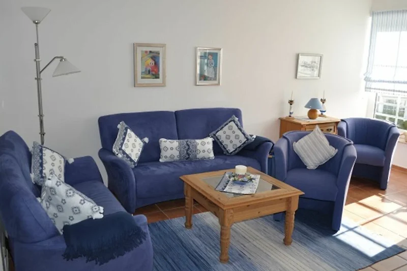 Farblich sind alle Möbelstücke und die Accessoires in der gesamten Wohnung in harmonischen Blautönen und natürlichen braunen Kiefertönen so aufeinander abgestimmt, dass diese Farbstimmung den besonderen Charme der Wohnungseinrichtung ausmacht. Der in einem warmen, hellen, rotbraunen Farbton geflieste Fussboden ist mit Teppichen und Läufern, farblich aufeinander abgestimmt und trägt so zum gemütlichen Ambiente der Wohnung bei.