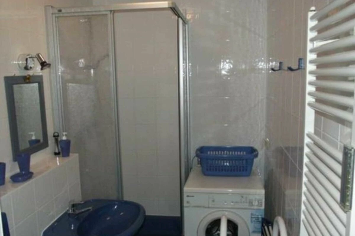 Das Schlafzimmer ist mit einem Doppelbett (180x200 cm) und einem Kinderbett (90x190cm) ausgestattet. Zur Grundausstattung der Wohnung gehört auch eine Waschmaschine im Duschbad. Ein Trockenraum befindet sich im Keller. Ein zweiter im abschliessbaren und überdachten Fahrradunterstand.