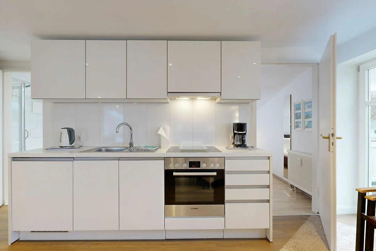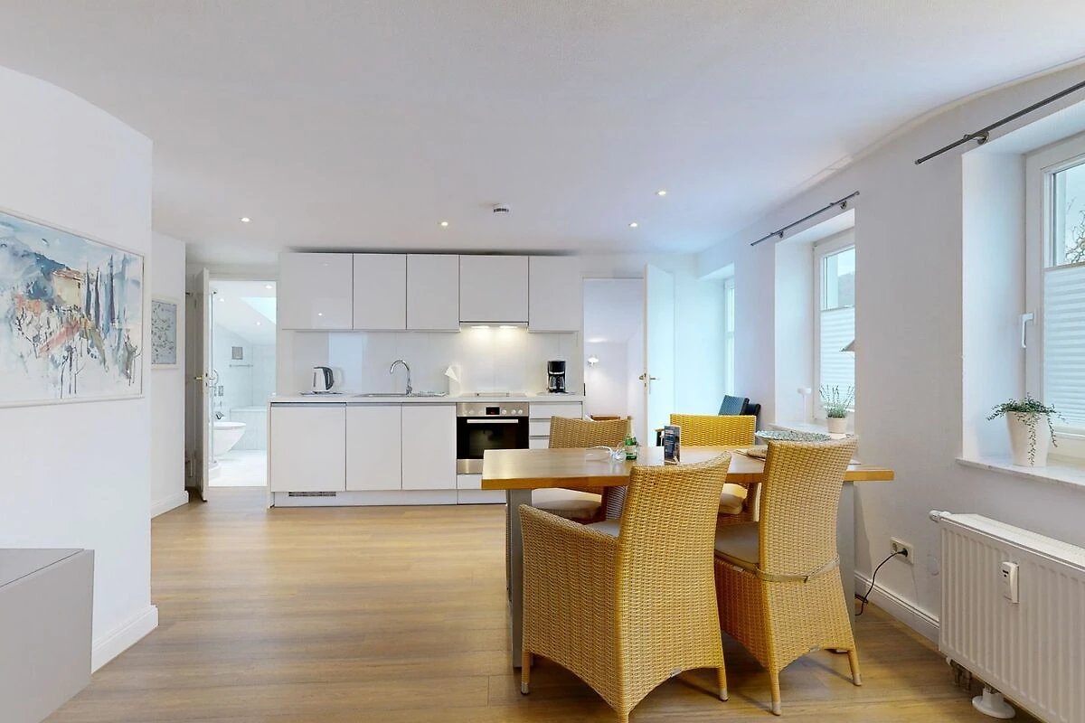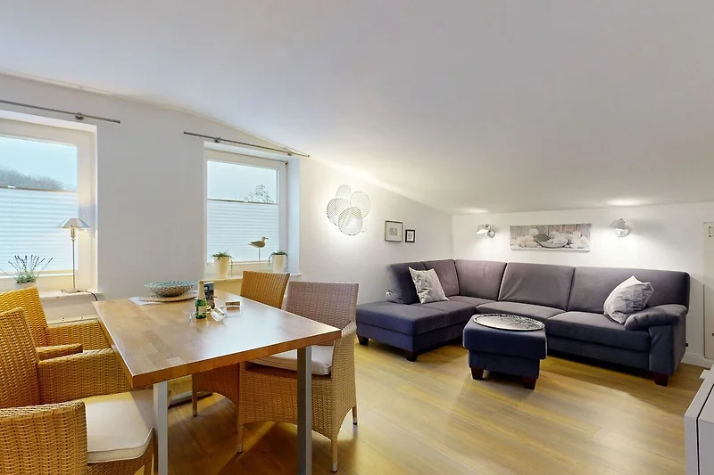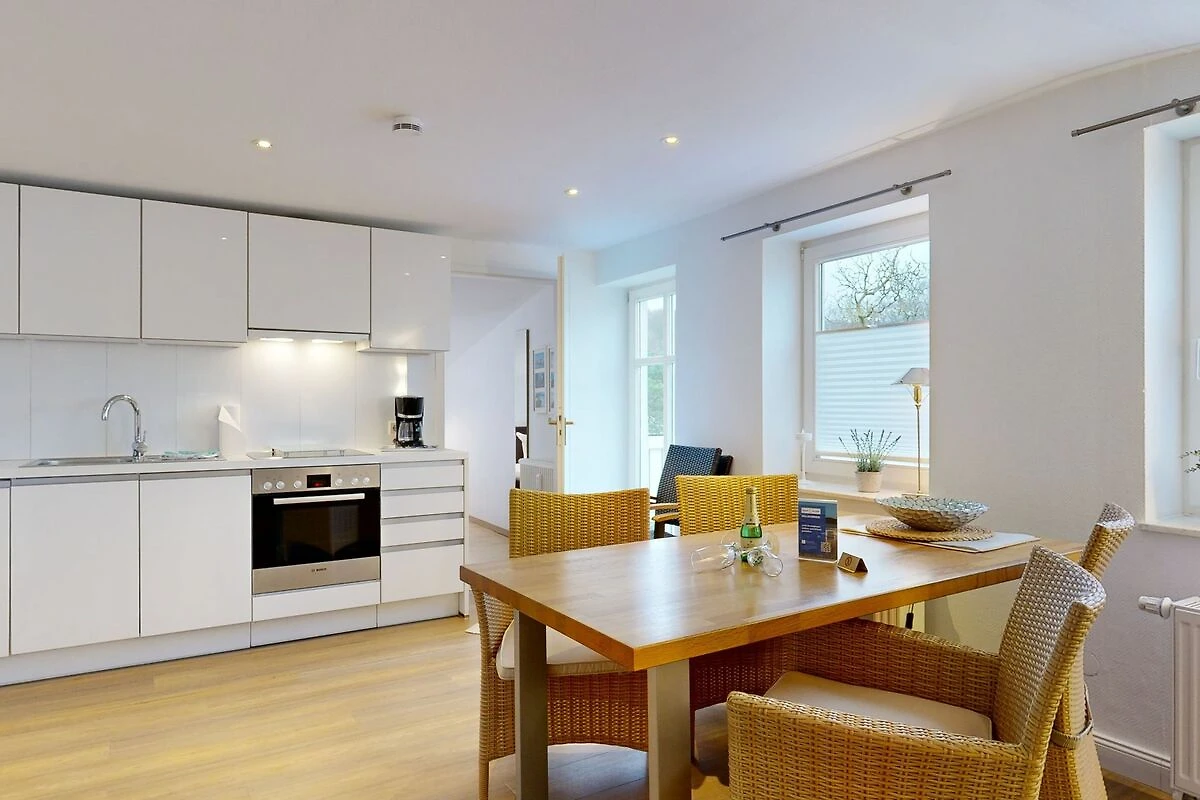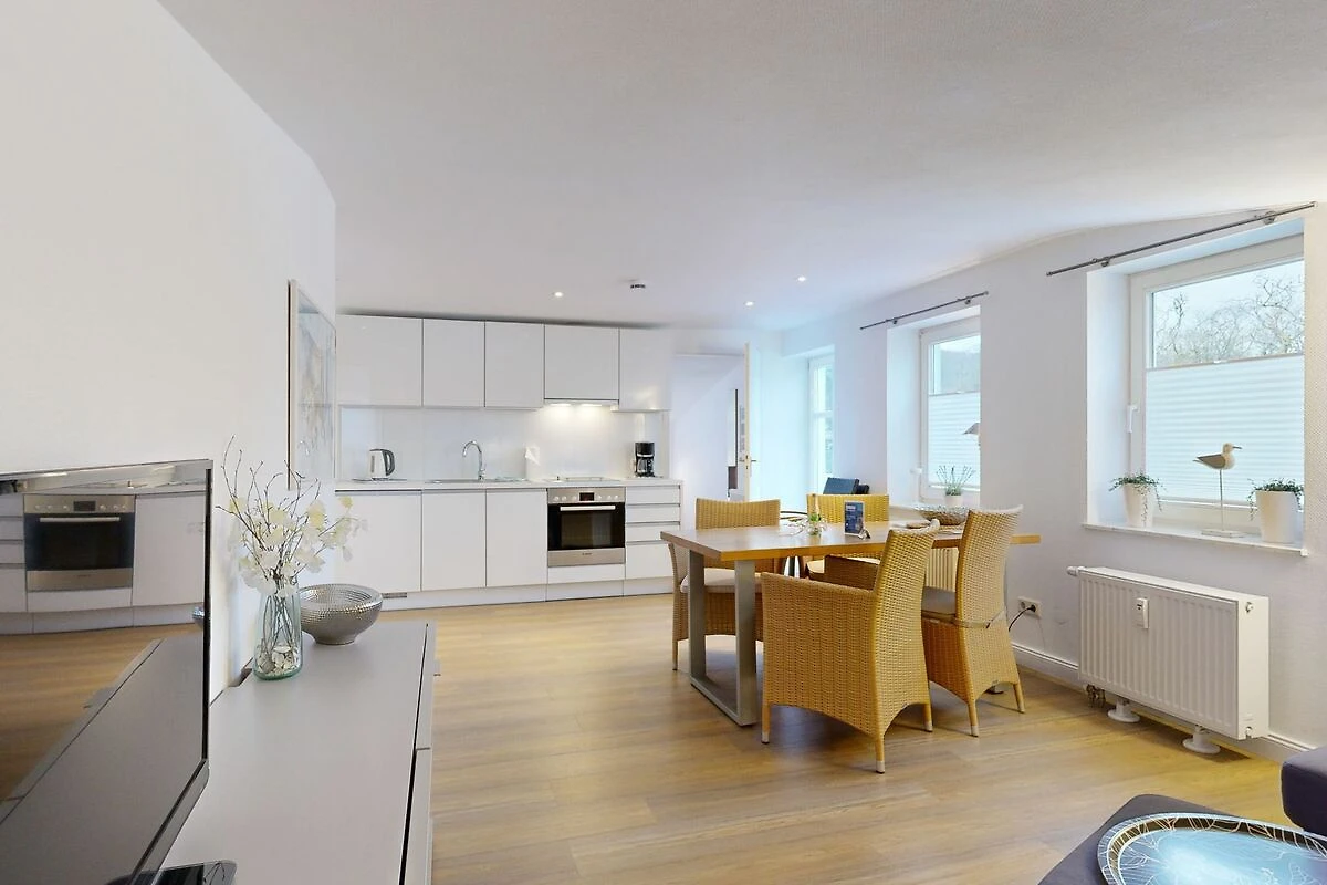 * Wohnzimmer: Moderne Couchgarnitur, Kabel-TV, Esstisch mit Blickr Richtung Kurmittelhaus, hochwertige Küchenzeile mit Spülmaschine, Ceranherd, Wasserkocher, Kaffeemaschine und Toaster