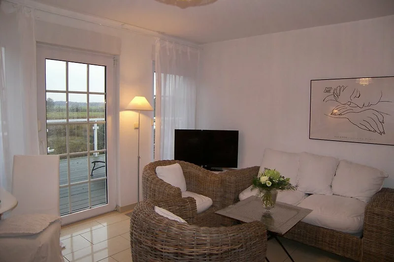Vom Wohnbereich aus haben Sie Zugang zur grosszügigen Balkonterrasse, welche Sie gemeinschaftlich mit der Ferienwohnung 2 nutzen können. Die Bettwäsche ist bereits inklusive.