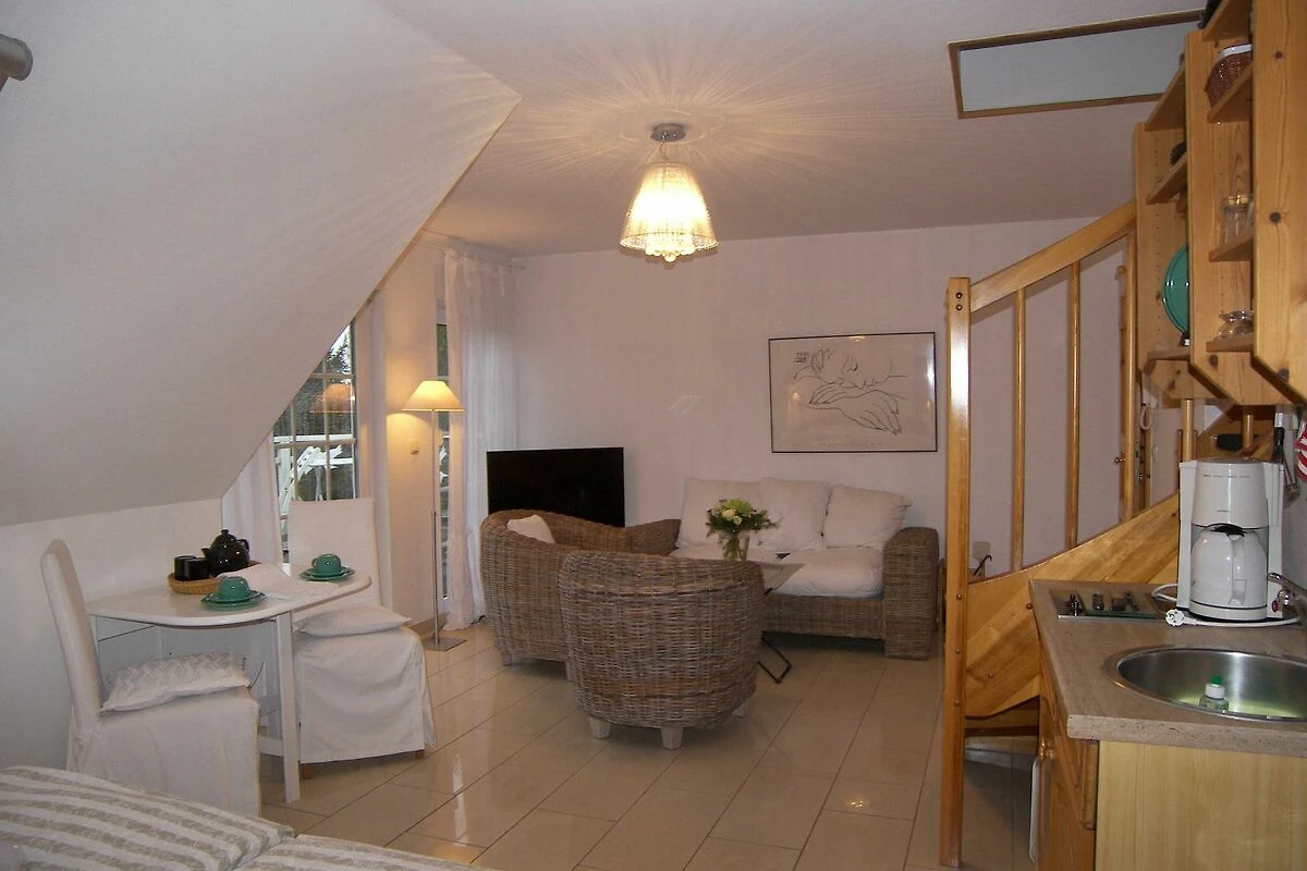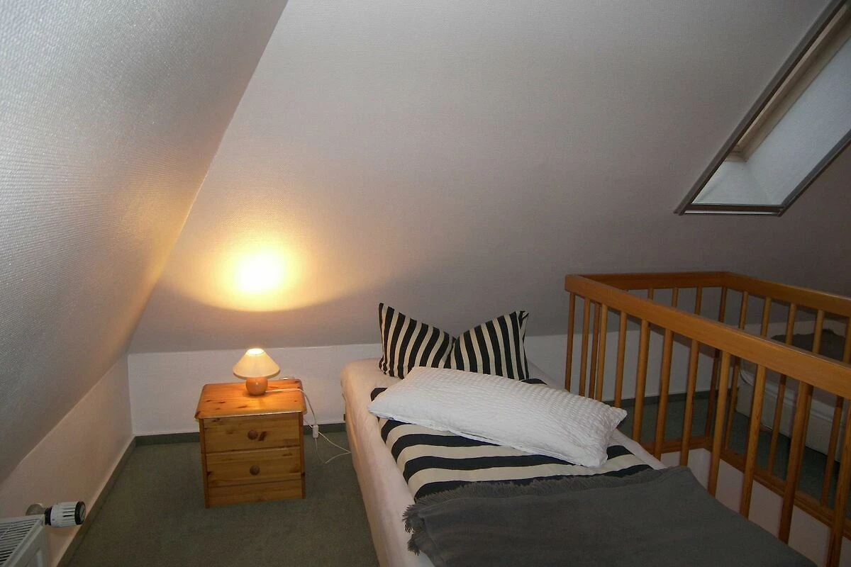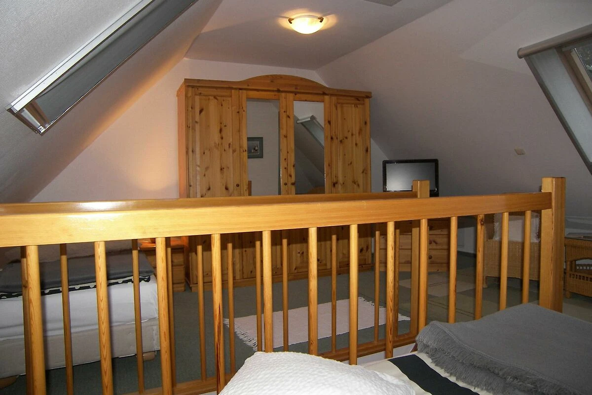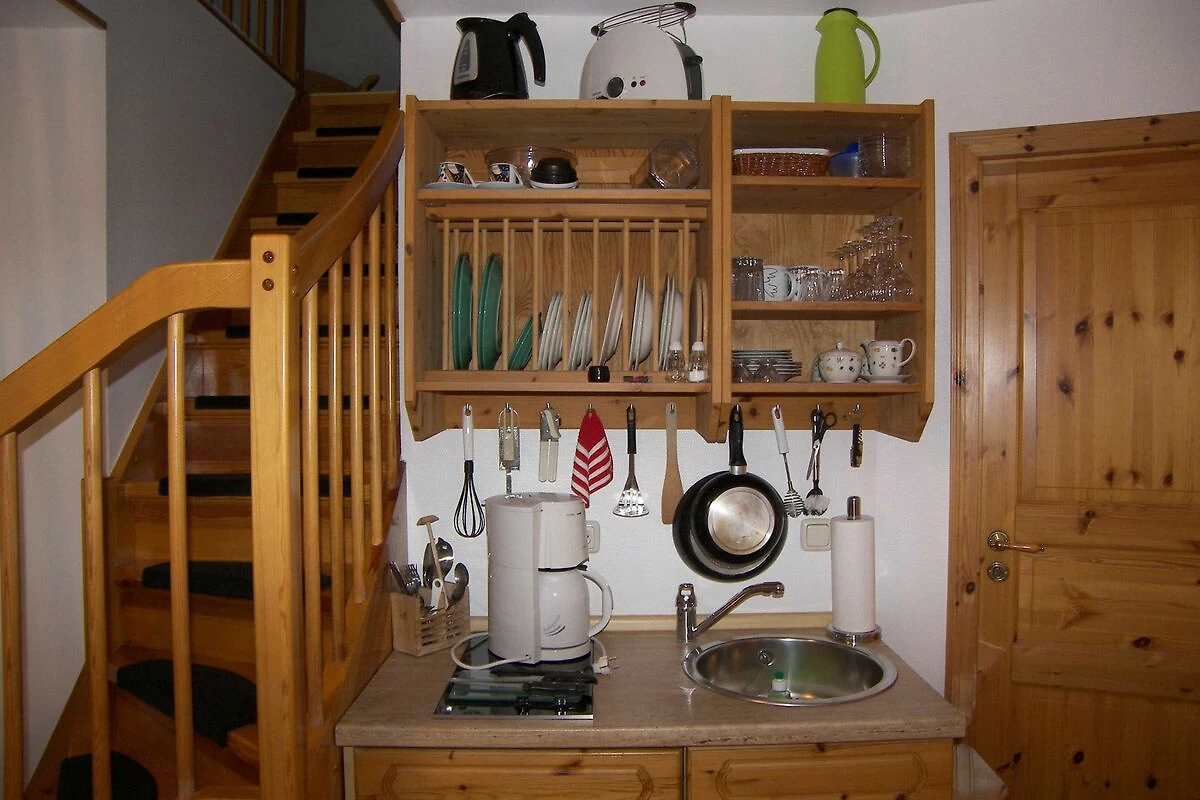 Die Maisonettewohnung befindet sich im 1. Obergeschoss und verfügt im unteren Bereich über einen kombinierten Wohn-/Schlafraum mit Doppelbett und gemütlicher Sitzecke, Flachbild-TV, Radio und W-LAN. Des Weiteren befindet sich auf gleicher Ebene die offene kleine Pantryküche mit 2-Kochfeld-Ceranplatte, Spülbecken, Kaffeemaschine, Toaster, Wasserkocher und Kühlschrank, sowie über einen kleinen Esstisch. Küchenrolle und ein Geschirrhandtuch werden bereitgestellt. Das Bad ist mit Dusche/WC, Handtuchheizung und Haartrockner ausgestattet. Über eine Treppe erreichen Sie den oberen Schlafbereich mit 2 Einzelbetten, einem grossen Kleiderschrank.