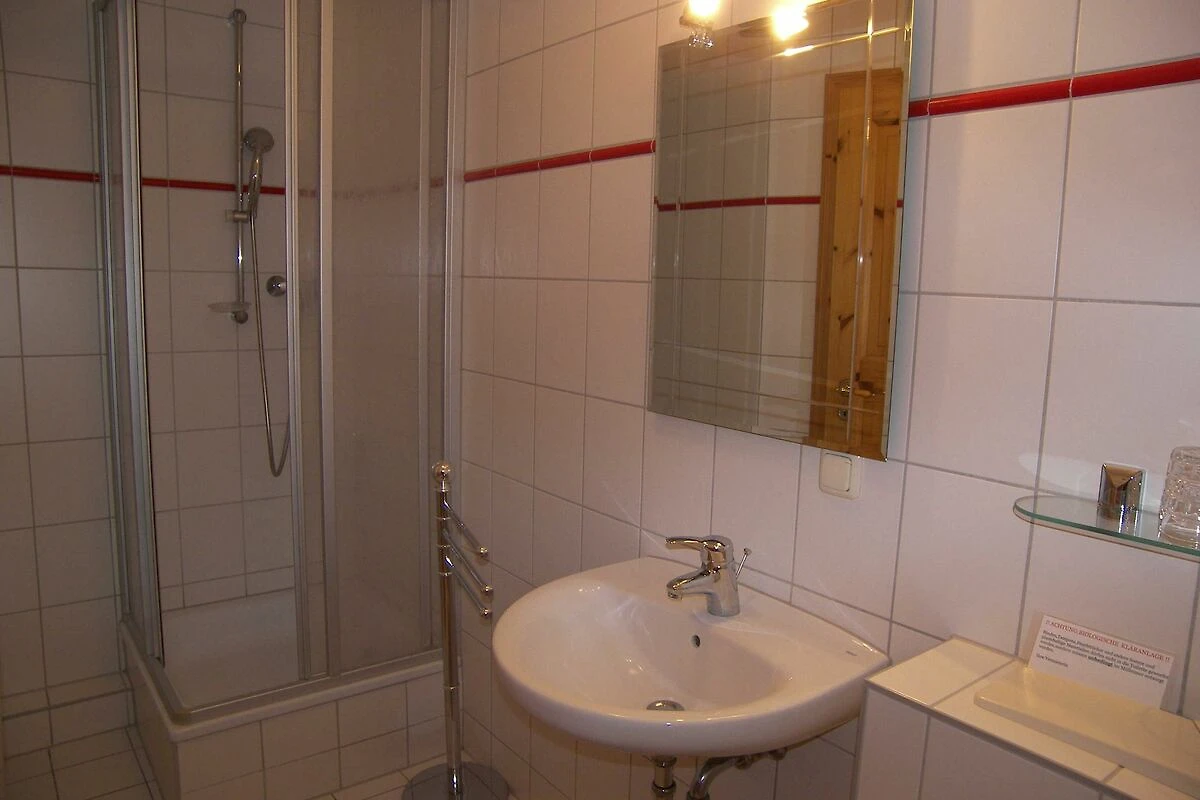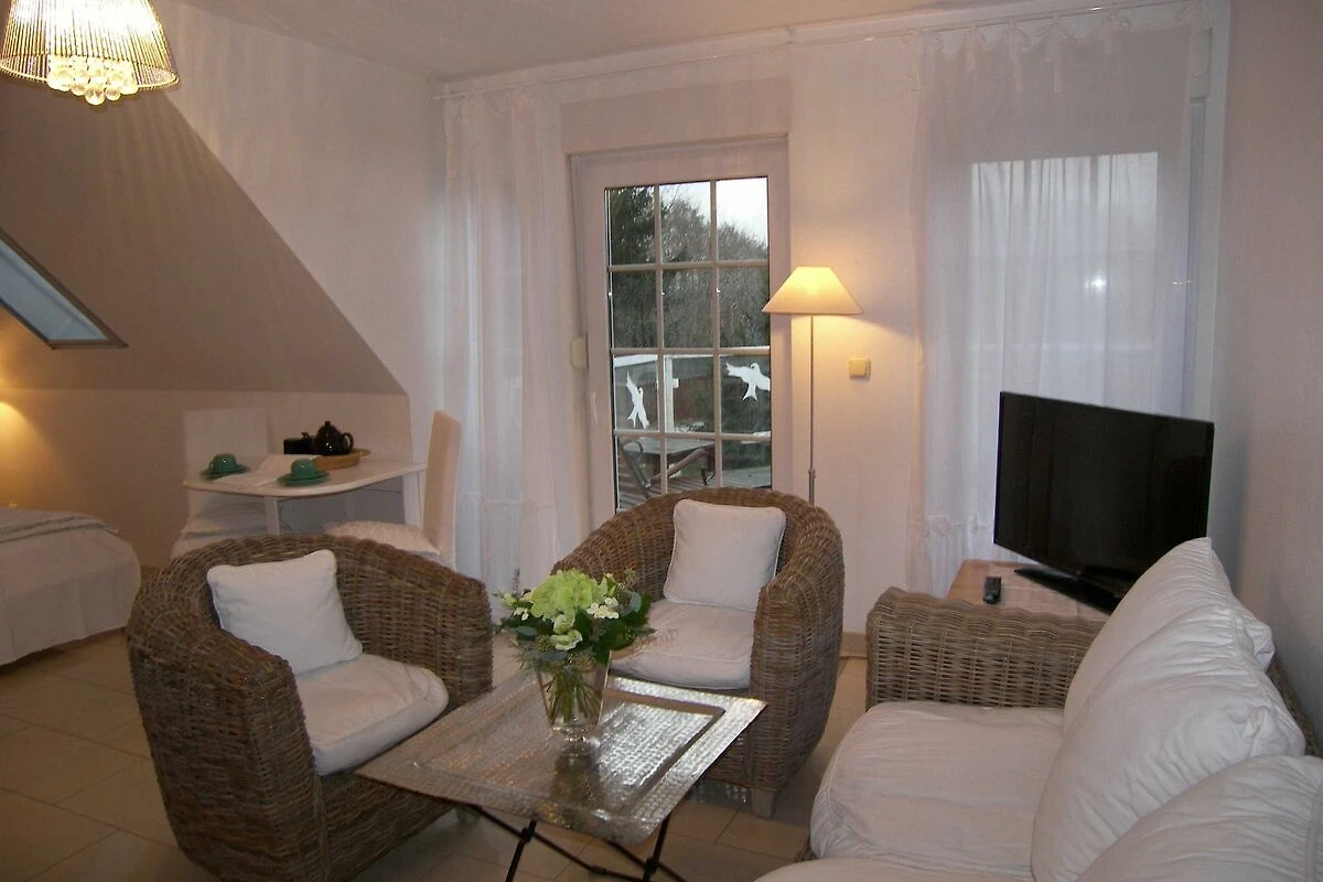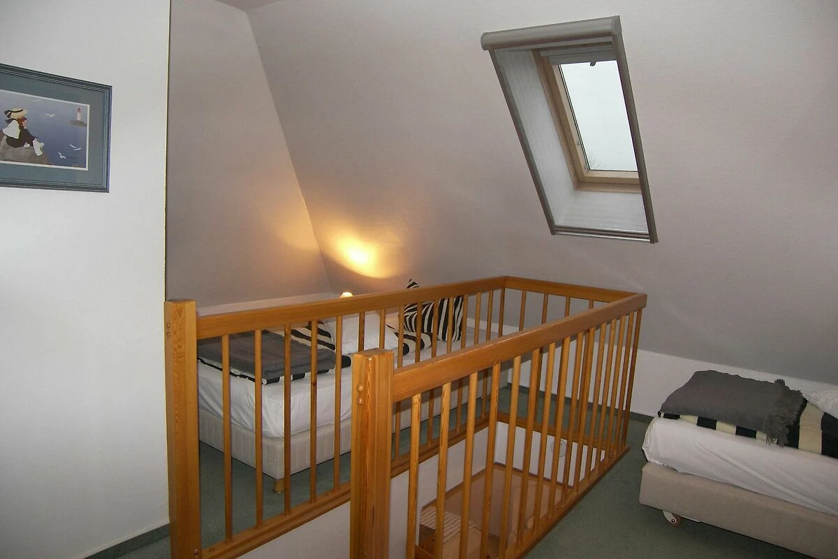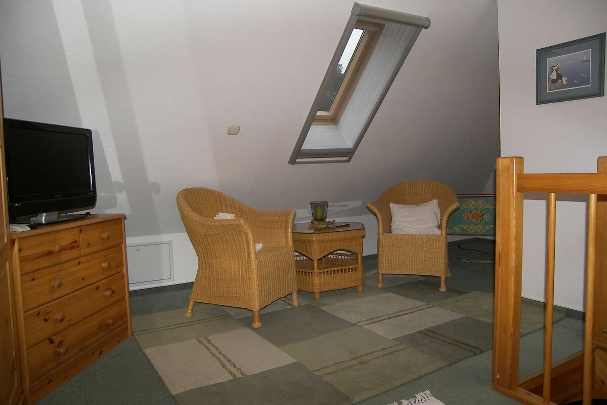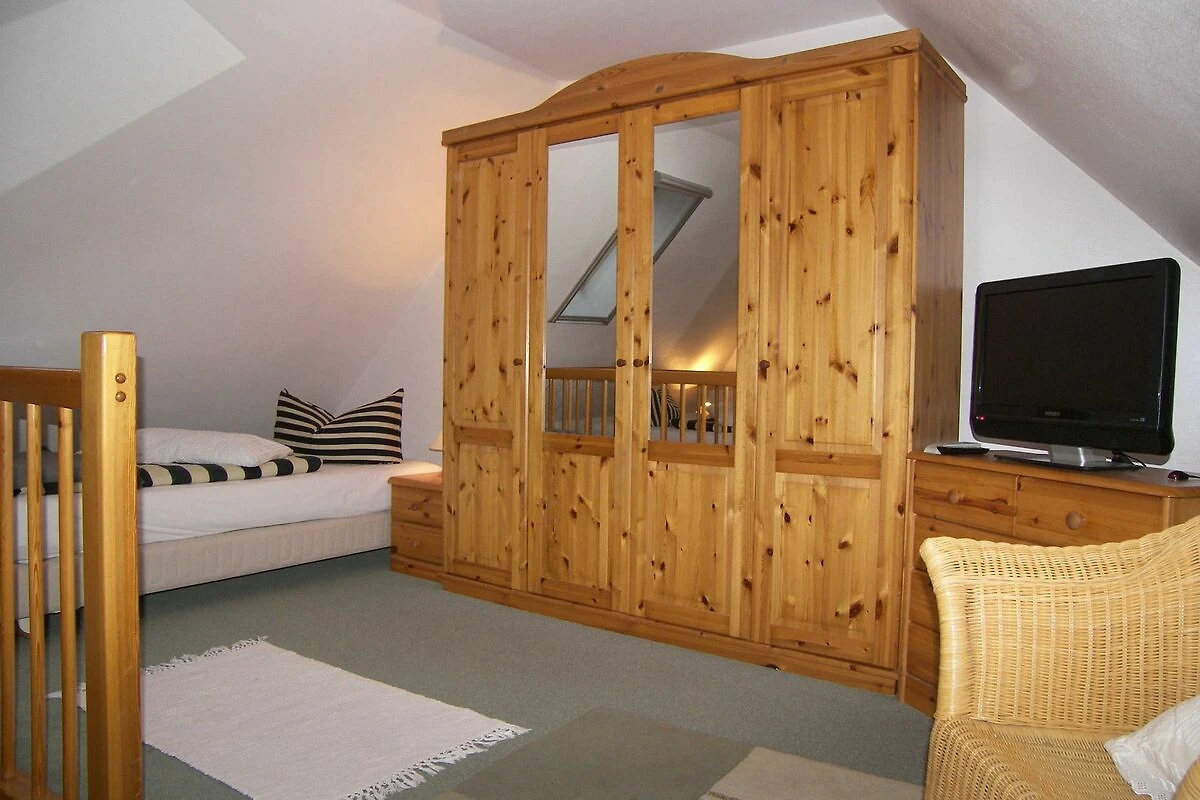 Die Maisonettewohnung befindet sich im 1. Obergeschoss und verfügt im unteren Bereich über einen kombinierten Wohn-/Schlafraum mit Doppelbett und gemütlicher Sitzecke, Flachbild-TV, Radio und W-LAN. Des Weiteren befindet sich auf gleicher Ebene die offene kleine Pantryküche mit 2-Kochfeld-Ceranplatte, Spülbecken, Kaffeemaschine, Toaster, Wasserkocher und Kühlschrank, sowie über einen kleinen Esstisch. Küchenrolle und ein Geschirrhandtuch werden bereitgestellt. Das Bad ist mit Dusche/WC, Handtuchheizung und Haartrockner ausgestattet. Über eine Treppe erreichen Sie den oberen Schlafbereich mit 2 Einzelbetten, einem grossen Kleiderschrank.