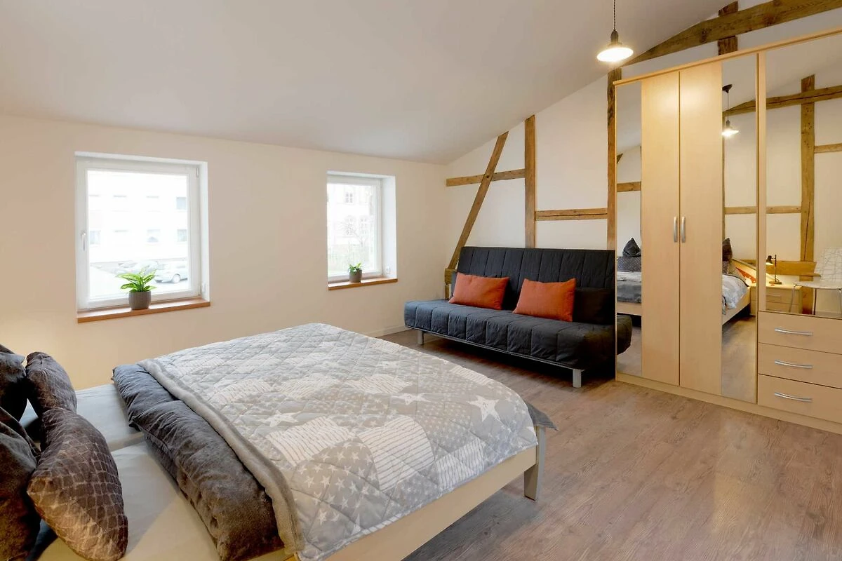 Die Ruhige und dennoch zentrale Lage unserer Unterkünfte ist besonders hervorzuheben. Der Bahnhof ist ca. 15 min zu Fuss entfernt, aber auch über nahe gelegene Bushaltestellen zu erreichen. Die Anbindung zum Autobahnzubringer macht die Anreise äusserst angenehm. Alle Sehenswürdigkeiten der Stadt, der Hafen und das Strandbad sind zu Fuss zu erreichen, etliche Restaurants befinden sich in der Nähe. Auch alle Dinge des täglichen Bedarfs sind in direkter Nähe zu finden und zu Fuss oder mit Rad zu erreichen. Bäcker und Einkaufsmöglichkeiten jeglicher Art sind am nahe gelegenen Frankendamm, sozusagen um die Ecke, vorhanden, so wie: Bushaltestellen, Arztpraxen, Apotheken. Als Einzeldenkmal verkörperte die alte Schmiede Städtebauliche Entwicklung des 19. Jahrhunderts. Das ehemalige Stallgebäude der Schmiede ist modern und nach dem neuesten Stand als Ferienhaus ausgebaut worden. Die Schmiede selber wurde Innen vollständig neu ausgebaut. So vermischt sich historisches Ambiente mit modernem Wohngefühl.