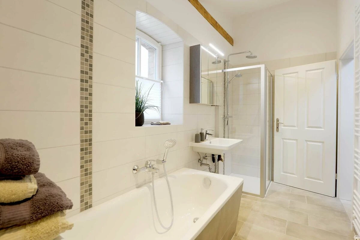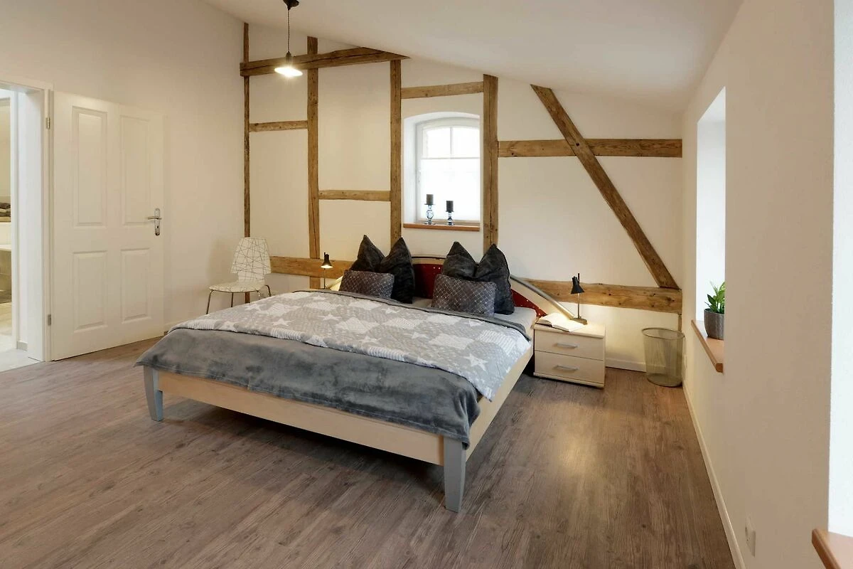 Unsere Wohnung zum Hufschmied befindet sich im Obergeschoss der Alten Schmiede und wurde in den historischen Mauern vollständig neu aufgebaut. Das Ferienhaus zum Stallmeister ist das alte Stallgebäude der Schmiede, welches aufgestockt und komplett saniert wurde.
