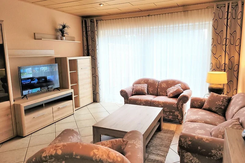 Abstellraum. Das Wohnzimmer ist mit einer Sitzecke, einem komfortablen