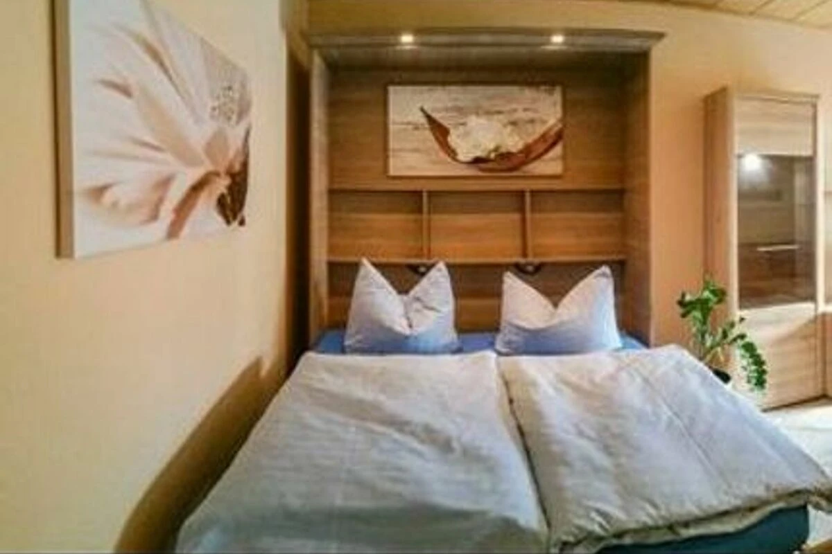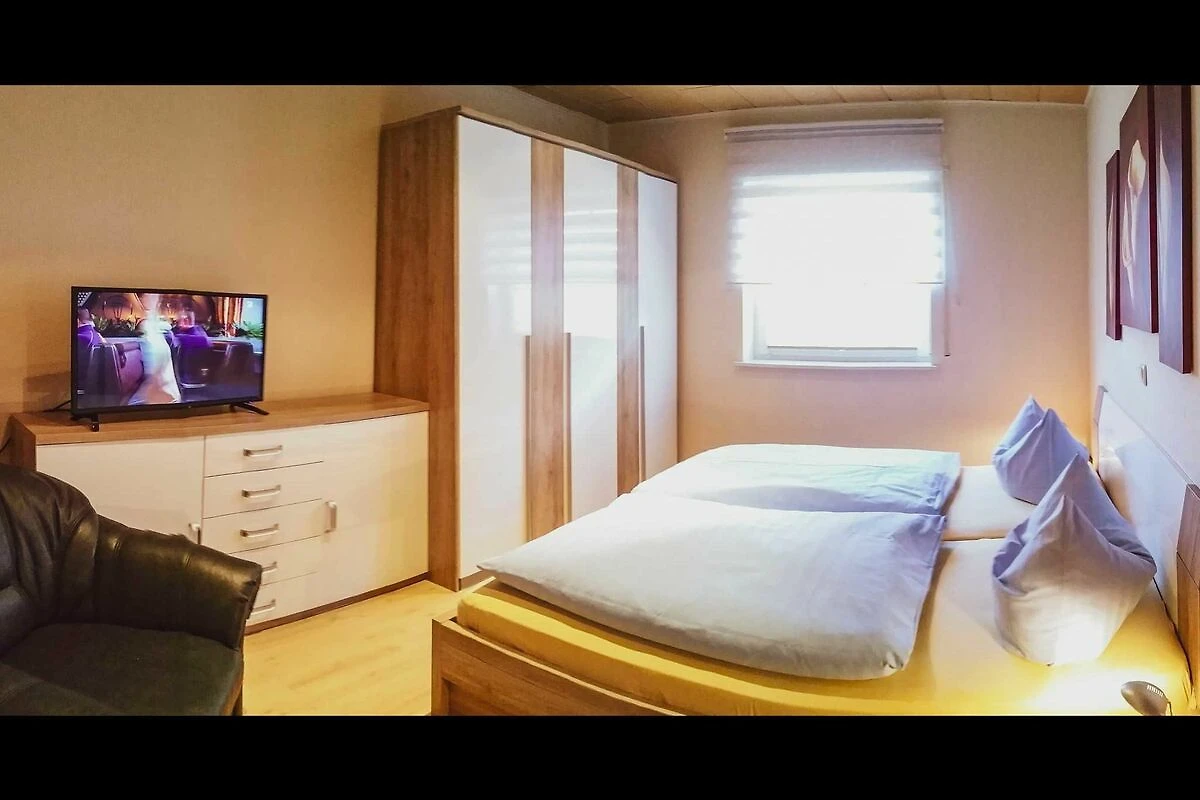 Doppelbett, Kleiderschrank, eine Kommode sowie ein zusätzlicher Flachbild-TV.