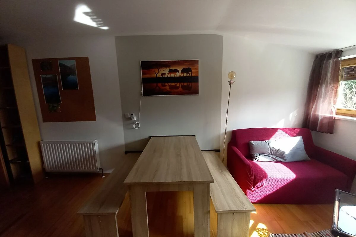 Umgeben von Grün (keine unmittelbare Nachbarn) an einer wenig befahrenen Nebenstrasse ist bei uns der ideale Ort um vom Stress des Alltags zu entspannen.