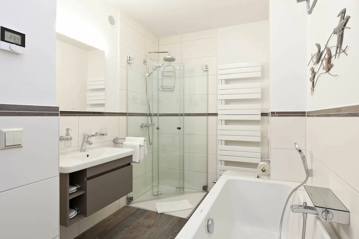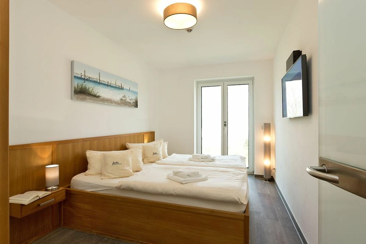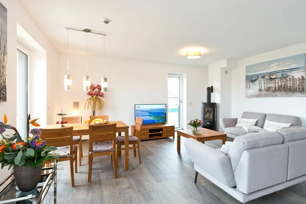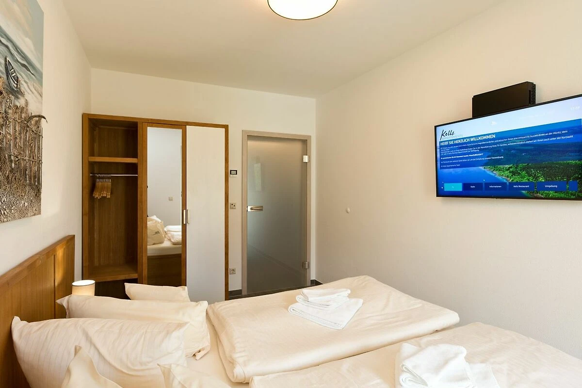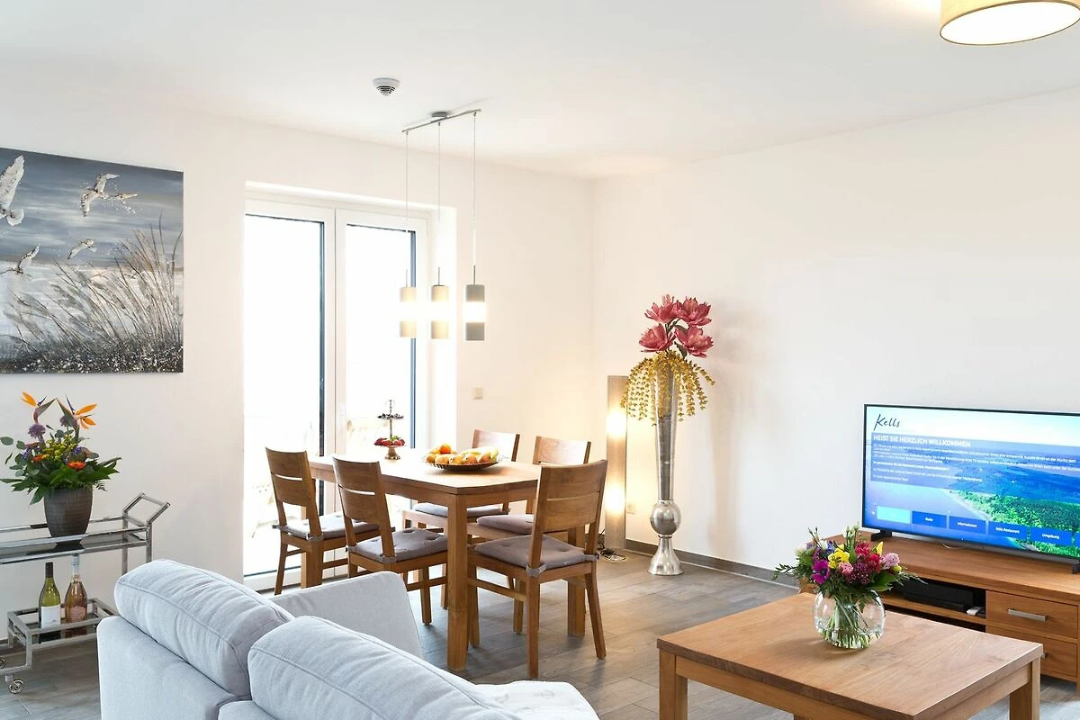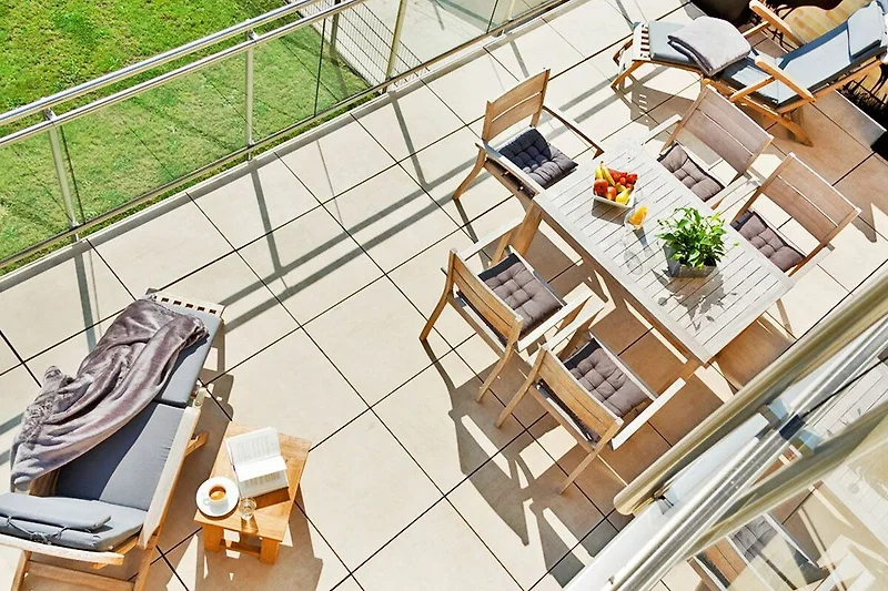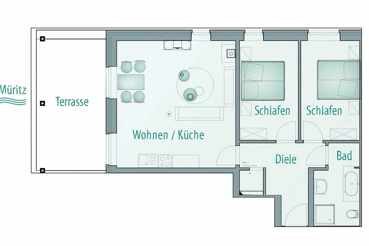 Ein grosses Wohnzimmer mit offener Küchenzeile und gemütlichem Essbereich, zwei gleich grosse Schlafzimmer, eine Schlafcouch im Wohnzimmer für zwei weitere Gäste, eine Vollbad mit Wanne und separater Dusche und ein 20 m² grosser Balkon / eine 20 m² grosse Terrasse: Das ist unser Appartement „Grosses Meer“ mit direktem Müritzblick ein Urlaubs-Zuhause für die ganze Familie. Bei Anreise sind die Betten bereits bezogen und ein Handtuchpaket (3 Handtücher, 1 Bademantel) liegt für jeden Gast bereit. Nach 7 Übernachtungen werden Handtücher und Bettwäsche kostenlos gewechselt.