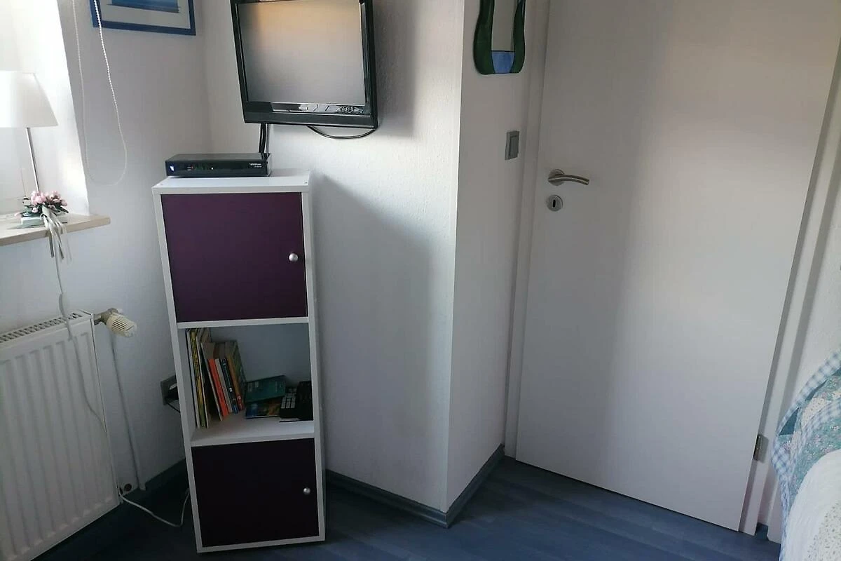 Im Schlafzimmer II stehen die beiden Betten getrennt. Ein kleiner Fernseher sorgt hier für Unterhaltung.