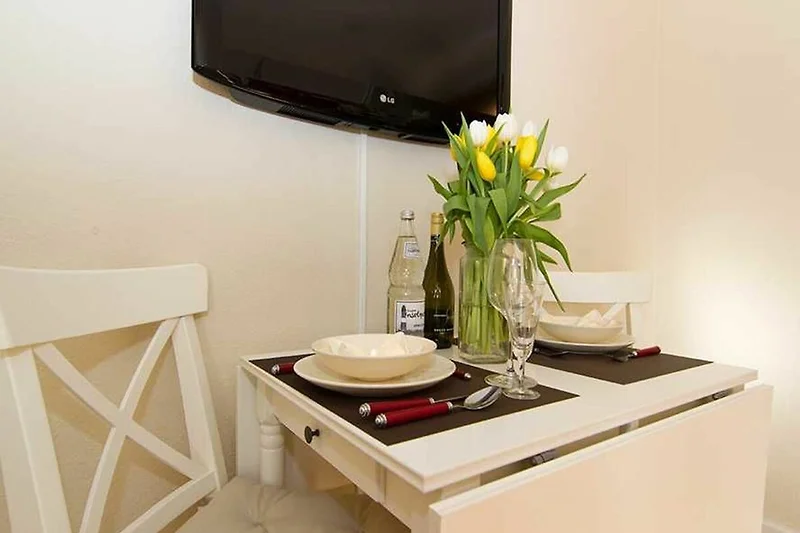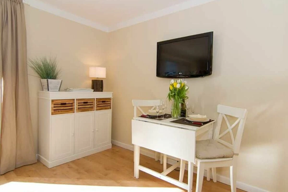 Das renovierte und sehr geschmackvoll eingerichtete 1-Raum Appartement befindet sich in Westerland auf Sylt im 2.OG. Das Appartement verfügt über einen kombinierten Wohn-/Schlafbereich mit einem sehr gemütlichen Doppelschrankbett, einer bequemen Couch und einem Esstisch für zwei Personen. Die separierte Küchenzeile ist mit einem Zwei-Platten Herd , einer Kaffeemaschine, einem Wasserkocher und einem Toaster ausgestattet. Das wunderschöne Badezimmer mit Dusche/WC wurde in 2023 aufwendig saniert und in eine Wellnessoase verwandelt. Der grosszügige Balkon Richtung Westen verfügt über Balkonmöbel und lädt zum entspannen ein.
