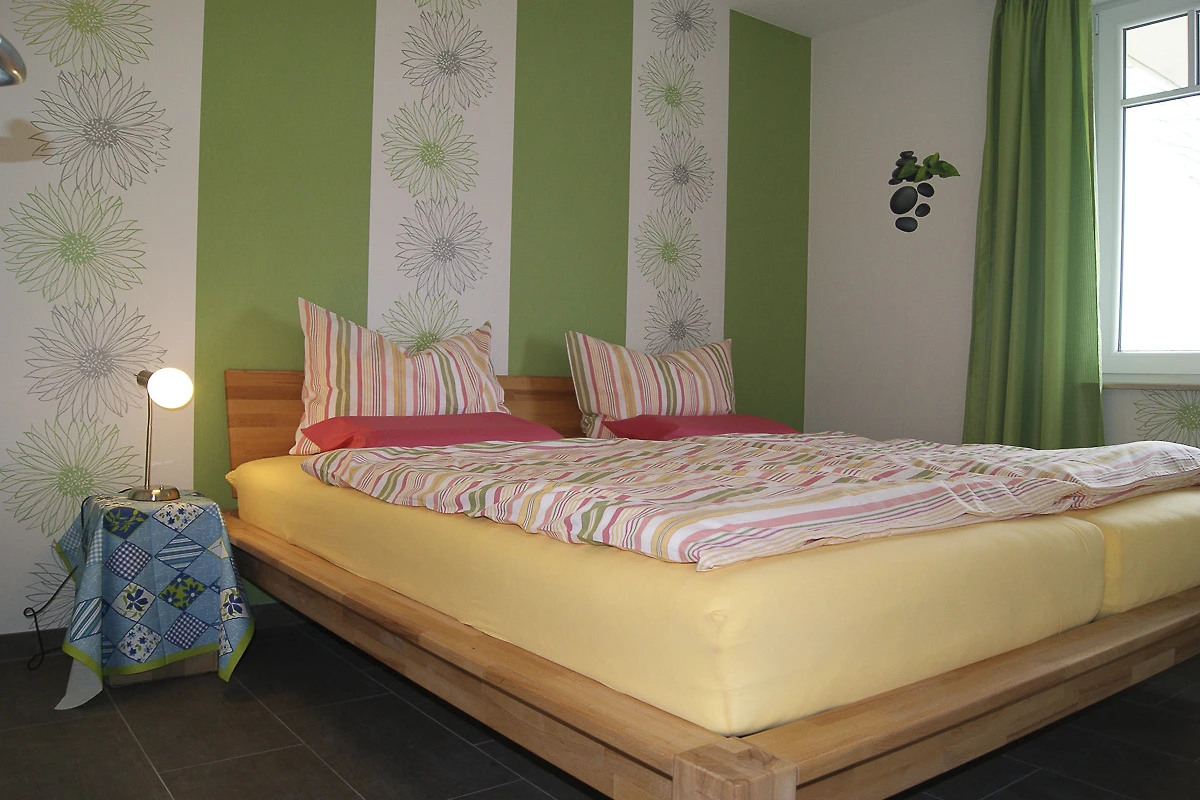 Das ruhige Schlafzimmer hat ein Doppelbett (200x200 cm) und einen Kleiderschrank.