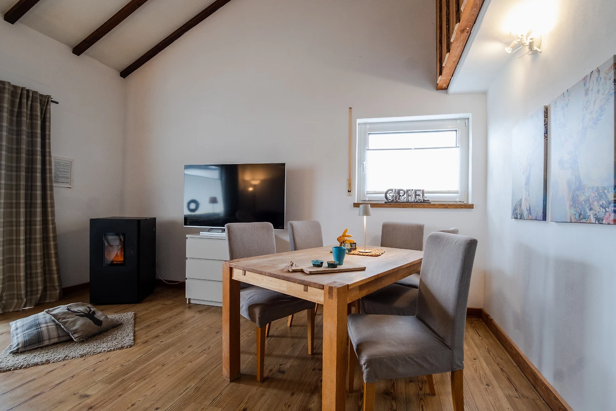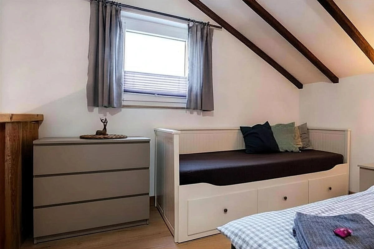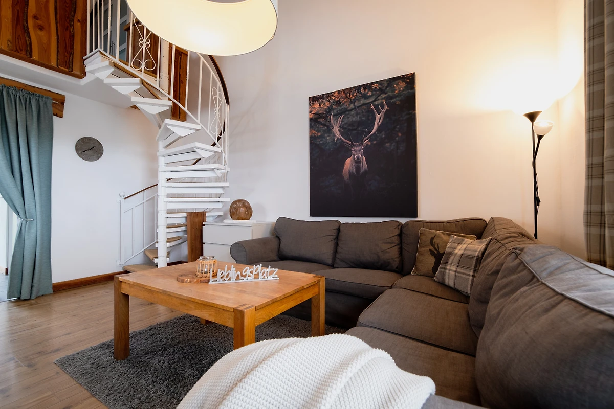Die offene Galerie im Obergeschoss sorgt mit einen ganz besonderen Charme für Heuboden-Feeling – natürlich mit allem Komfort einer modernen Ferienunterkunft. Der Schlafbereich strahlt Wärme und Gemütlichkeit aus und bietet Platz für 2 bis 4 Personen. Neben einem Doppelbett finden Sie dort ein Tagesbett, das sich bei Bedarf zu einem weiteren Doppelbett ausziehen lässt – ideal für Paare, kleine Familien oder Freundinnen, die gemeinsam reisen.