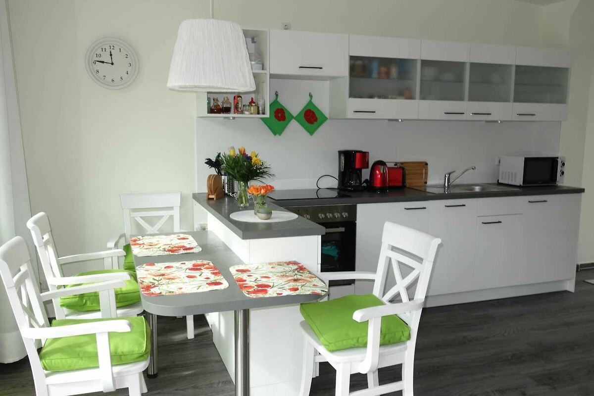 Küche mit 4 Ceranfeldern und Backofen, Spülmaschine, Toaster, Kaffeemaschine, Wasserkocher, Mikrowelle mit Grillfunktion, Eierkocher und Kühlschrank mit 3-Sterne-Gefrierfach