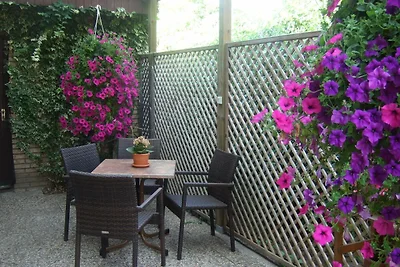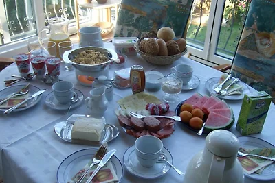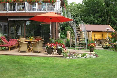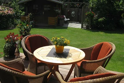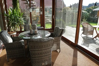 Unsere gemütlich eingerichtete Ferienwohnung erreichen Sie über einen separaten Eingang. Der ca. 46qm grosse Wohn-Esszimmerbereich ist wie die gesamte Wohnung freundlich gestaltet und modern eingerichtet. Dem Esszimmer schliesst sich der möblierte Wintergarten an. Von dort, wie auch vom Wohnzimmer, haben Sie einen ungehinderten Ausblick in den schönen Garten, der zur Mitnutzung zu Verfügung steht. Vor dem Wintergarten befindet sich die möblierte Terrasse. Die komplett ausgestattete Küche verfügt über einen Ausgang zu unserer zweiten, in diesem Fall, überdachten Terrasse. In der Wohnung befindet sich ebenfalls ein Geschirrspüler, eine Waschmaschine & ein Trockner zur inklusiv Nutzung.