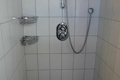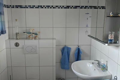 Waschtisch, WC, Bidet und eine ebenerdig begehbare Dusche mit Pendeltür. Zusätzlich gibt es noch ein separates Gäste-WC mit einem 60cm breitem Waschtisch.