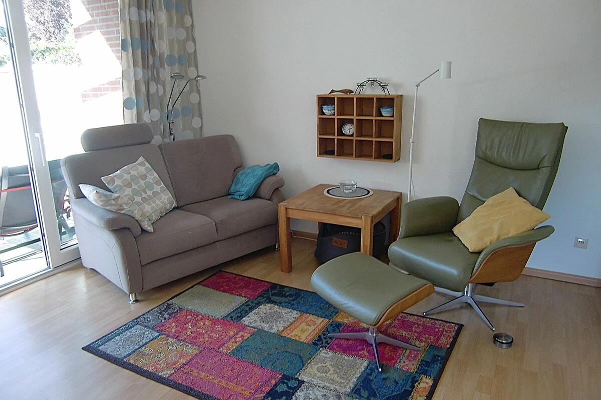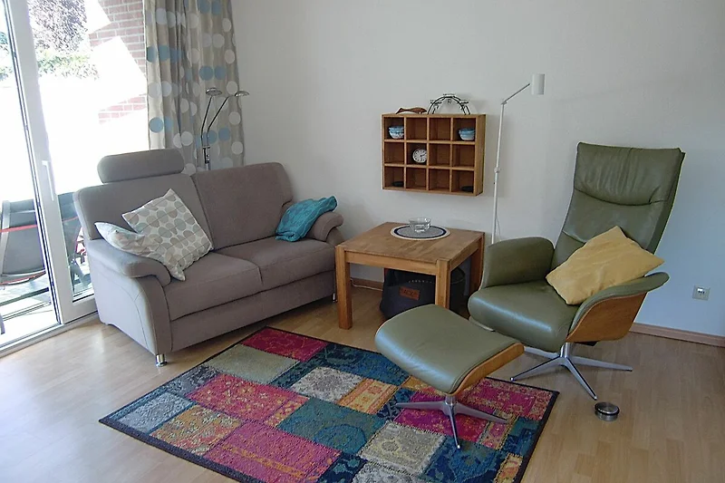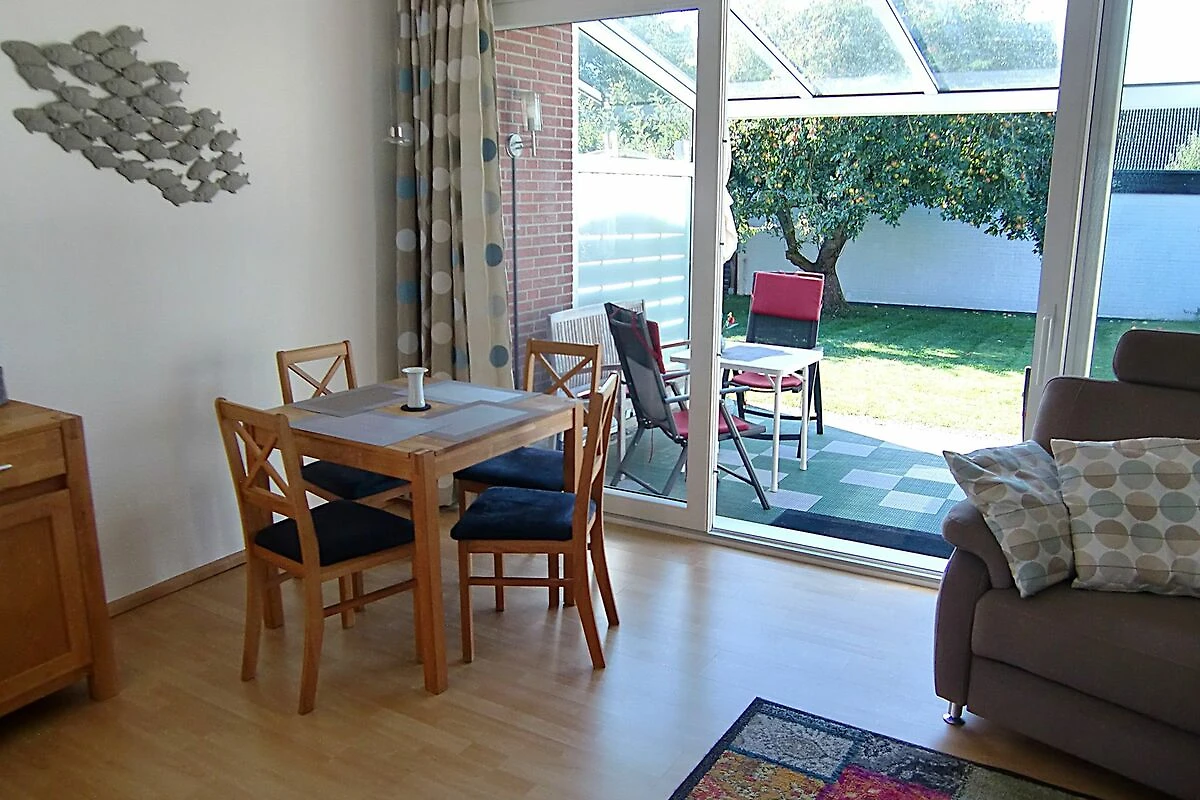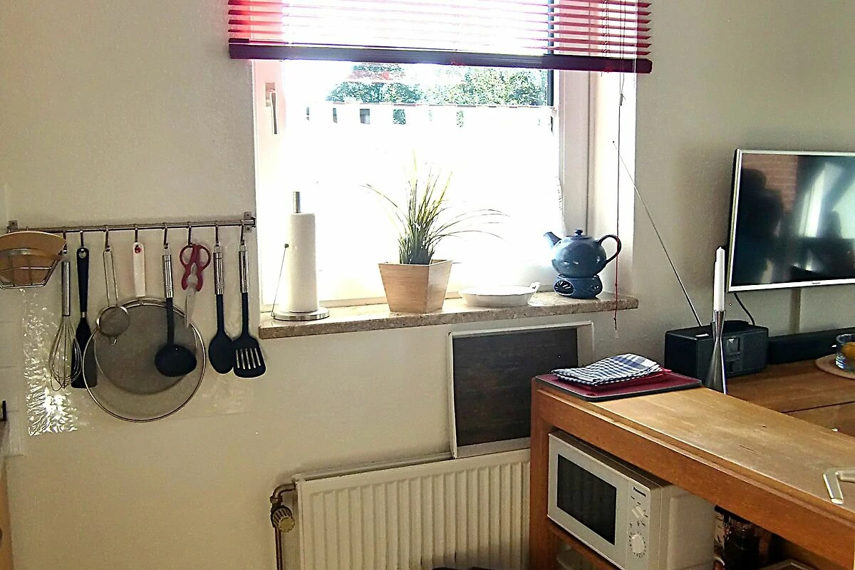 Kleines Endreihenhaus (56 m²) über zwei Etagen. Im Erdgeschoss befinden sich das Wohnzimmer mit gemütlicher Sitzecke, Smart-TV, WLAN, Radio, Essecke mit offener Küchenzeile (mit Herd und Backofen) und ein Duschbad/WC.