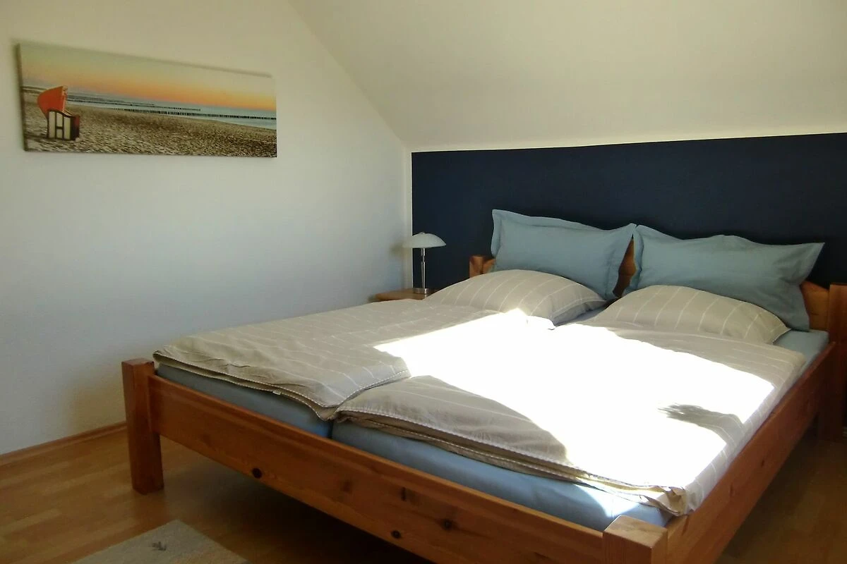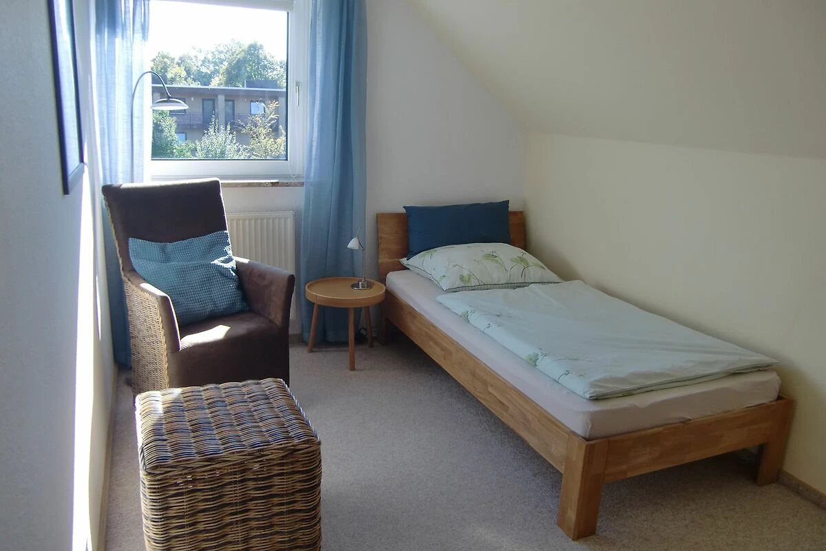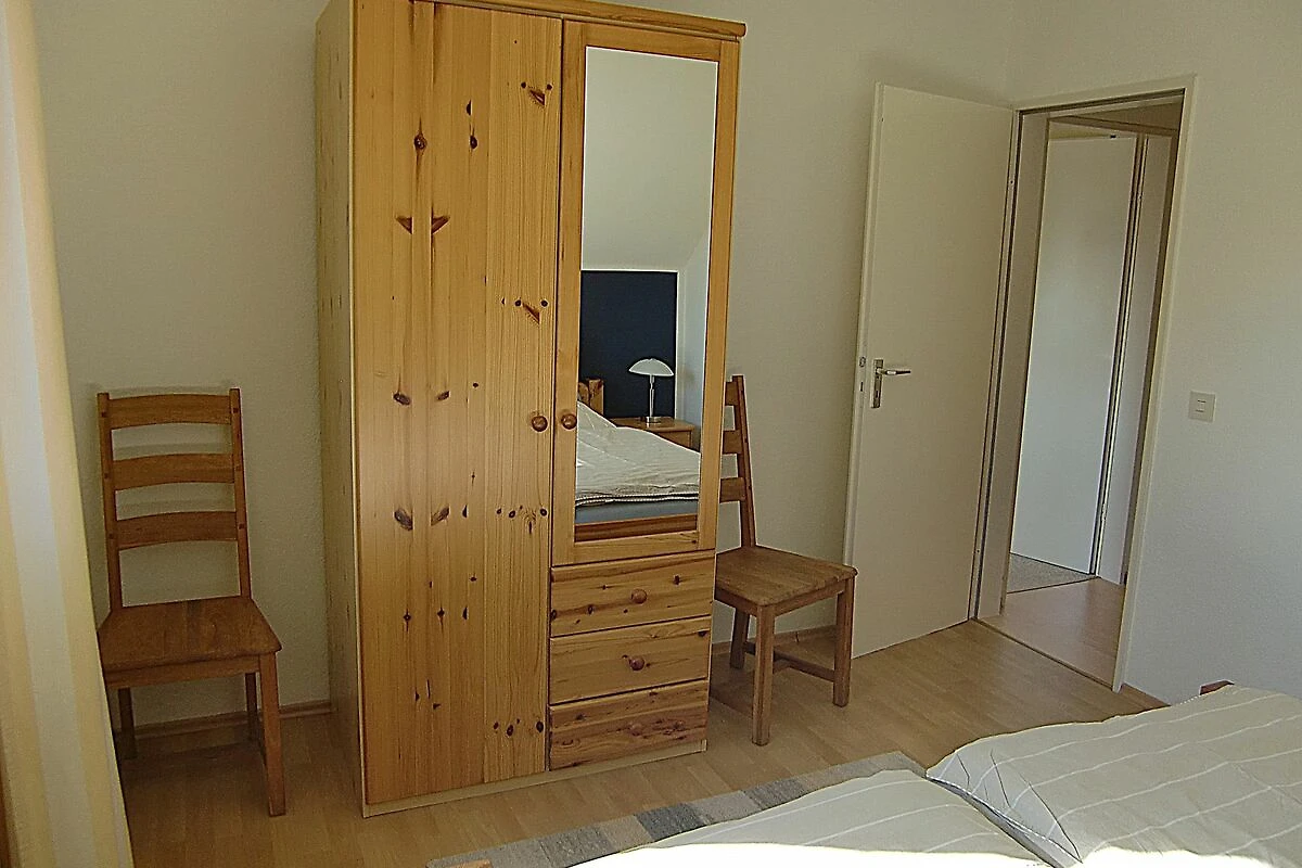 Über eine Holztreppe gelangen unsere Gäste in den Schlafbereich. Ein Schlafzimmer mit Ehebett und Kleiderschrank und ein Schlafzimmer mit einem Einzelbett sind dort vorhanden. Die Betten sind bei Anreise bezogen und die Handtücher liegen bereit.