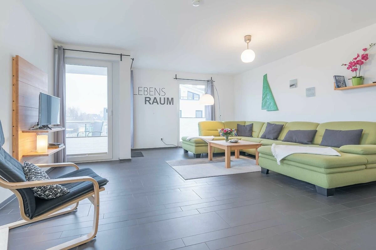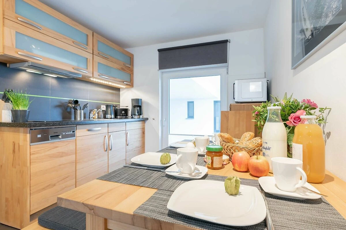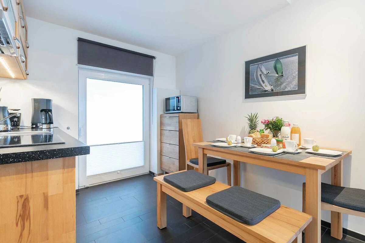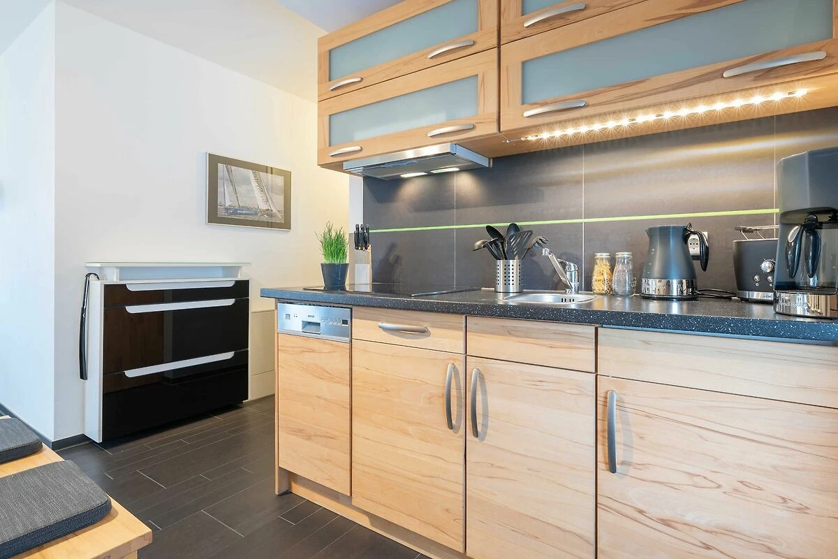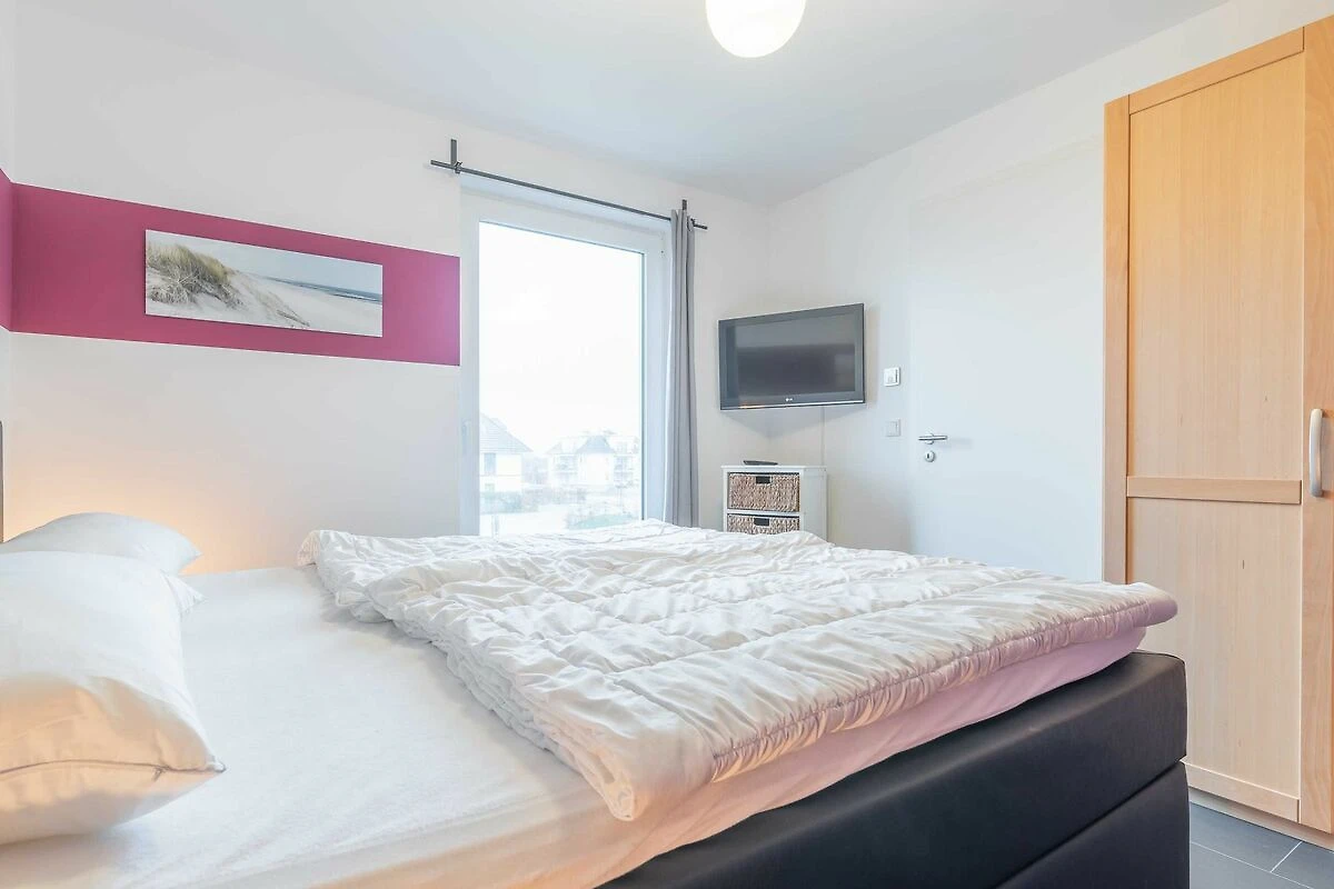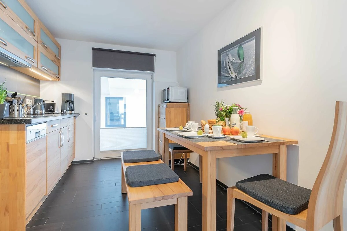 Zur Wohnung gehören ein Ostbalkon mit Meerblick und ein kostenfreier PKW-Stellplatz in der Tiefgarage. Bitte beachten Sie die Durchfahrtshöhe von max. 1,90 m. Von der Tiefgarage aus können Sie mit dem Fahrstuhl bequem zur Wohnung fahren. Am Eingang des Objekts befinden sich zudem Fahrradständer. Die modern eingerichtete Ferienwohnung bietet Ihnen ein grosses Wohnzimmer mit Koch- und Essbereich und eine bequeme Schlafcouch für zwei weitere Personen. Bunte Unterhaltung bietet ein LCD-Satelliten-TV mit Radio und DVD-Spieler. Das grosse Schlafzimmer ist mit einem Kleiderschrank und einem komfortablen Doppelbett (durchgängige Matratze) eingerichtet. In der kompletten Wohnung ist eine Fussbodenheizung installiert. Vom Wohnbereich aus gelangen Sie nach draussen auf den Balkon. Im Bad befinden sich eine ebenerdige Dusche, ein WC und ein Waschtisch mit grossem Spiegel. Ein Föhn ist vorhanden. Des Weiteren finden Sie eine komplett eingerichtete Einbauküche mit Cerankochfeld, Kühlschrank mit Gefrierfach, Geschirrspüler, Wasserkocher, Kaffeemaschine, Toaster und eine Mikrowelle mit Backfunktion.