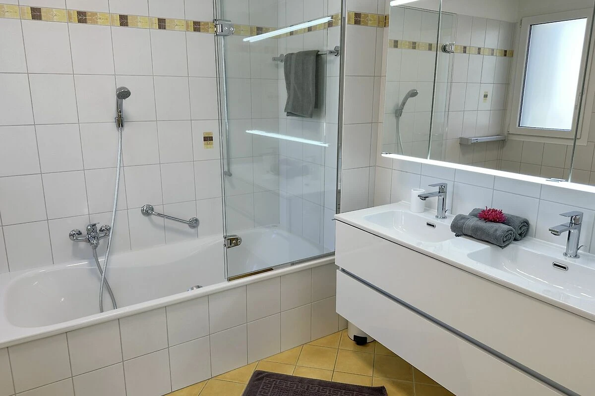 Das grossräumige moderne 4.5 Zimmer-Appartement verfügt über eine mit allem Komfort ausgestattete, grosse Einbauküche mit Frühstücksbar. Das Wohn- Esszimmer hat ein gemütliches Sofa und einen grossen Esstisch. Vom Wohnraum gelangt man zur geschützten Terrasse mit Granitboden und Gartenmöbel. Zwei Doppelschlafzimmer, sowie ein weiteres Gästezimmer mit Schlafsofa bieten angenehm Raum für Familen. Ein Badezimmer mit Wanne / Dusche / WC sowie ein weiteres Bad mit Dusche / WC. 2 reservierte Parkplätze stehen zur Verfügung.