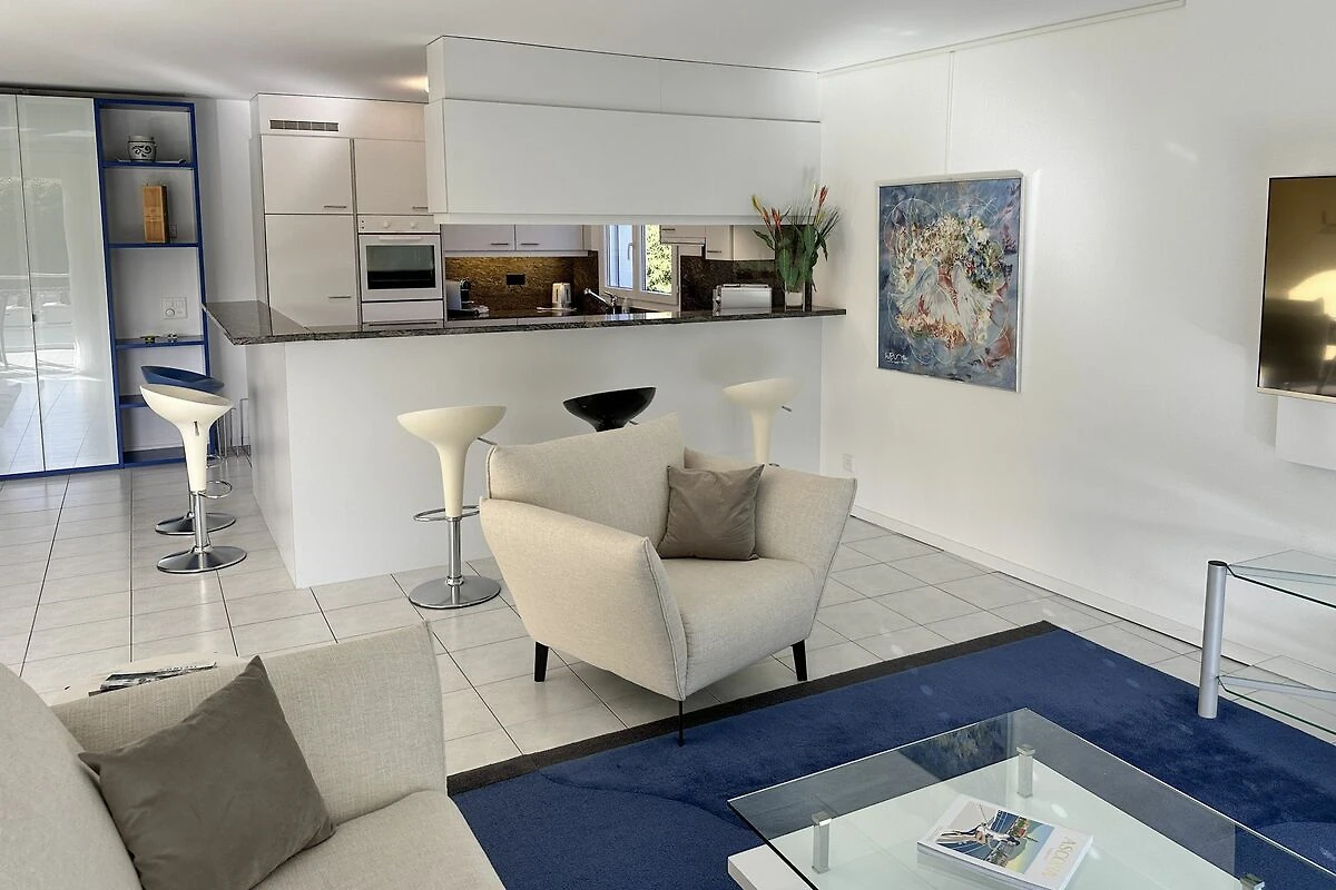 Die Wohnung befindet sich im 1. Stock eines Appartmenthauses in einem ruhigen Residenzviertel von Ascona, in der Nähe des Golfplatzes, des Hafens und des Lidos von Ascona. Einkaufsmöglichkeiten, Restaurants, Bank und Post finden Sie im Zentrum von Ascona. Bushaltestelle nur wenige Gehminuten entfernt.