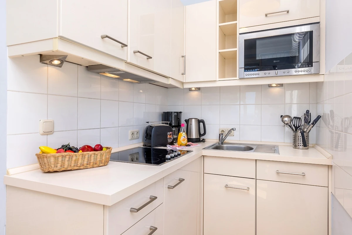 Im zweiten Raum befinden sich der Schlafbereich mit Doppelbett und die schicke Küchenzeile mit Geschirrspüler, Mikrowelle, 4-Platten-Kochfeld, Kühlschrank mit Gefrierfach, Kaffeemaschine, Wasserkocher und Toaster.