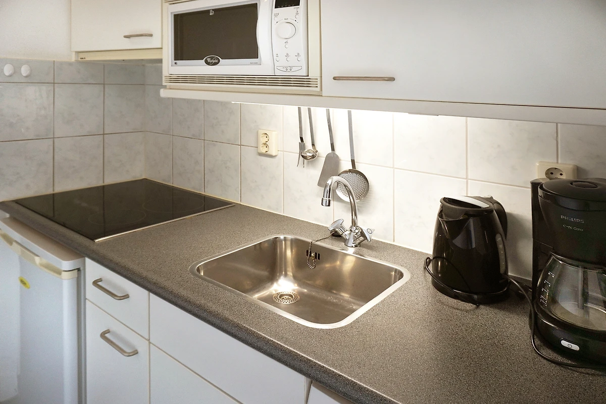 eine Küche mit Geschirrspüler, ein Badezimmer mit Dusche und Toilette sowie ein Schlafzimmer mit Doppelbett. Im Wohnzimmer gibt es einen Schlafcouch für eine eventuelle 3. Person. Das Apartment verfügt über WLAN, das Sie kostenlos nutzen können.