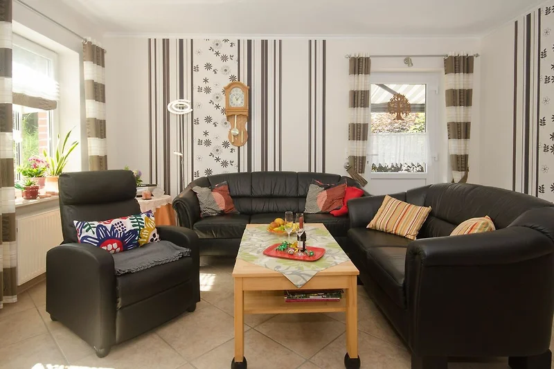 In dem grossen, hellen Wohnzimmer steht eine Couchgarnitur mit einem Fernsehsessel mit Tisch und eine Schrankwand mit grossem Flachbildschirm. Ausserdem können Sie ein einer kleinen Stuhl-und-Tisch-Combi gemütlich ein Buch lesen. In der Küche finden Sie alles was Sie benötigen: Wasserkocher, Kaffeemaschine, kleiner Backofen sowie einen Kühlschrank und eine 2 Herdplatte. Im geräumigen Schlafzimmer steht ein Doppelbett, ein grosser Wandschrank sowie zwei Stühle. Badezimmer mit Dusche und WC. Maximal 2 Erwachsene Personen und 1 Kleinkind sind unterzubringen.