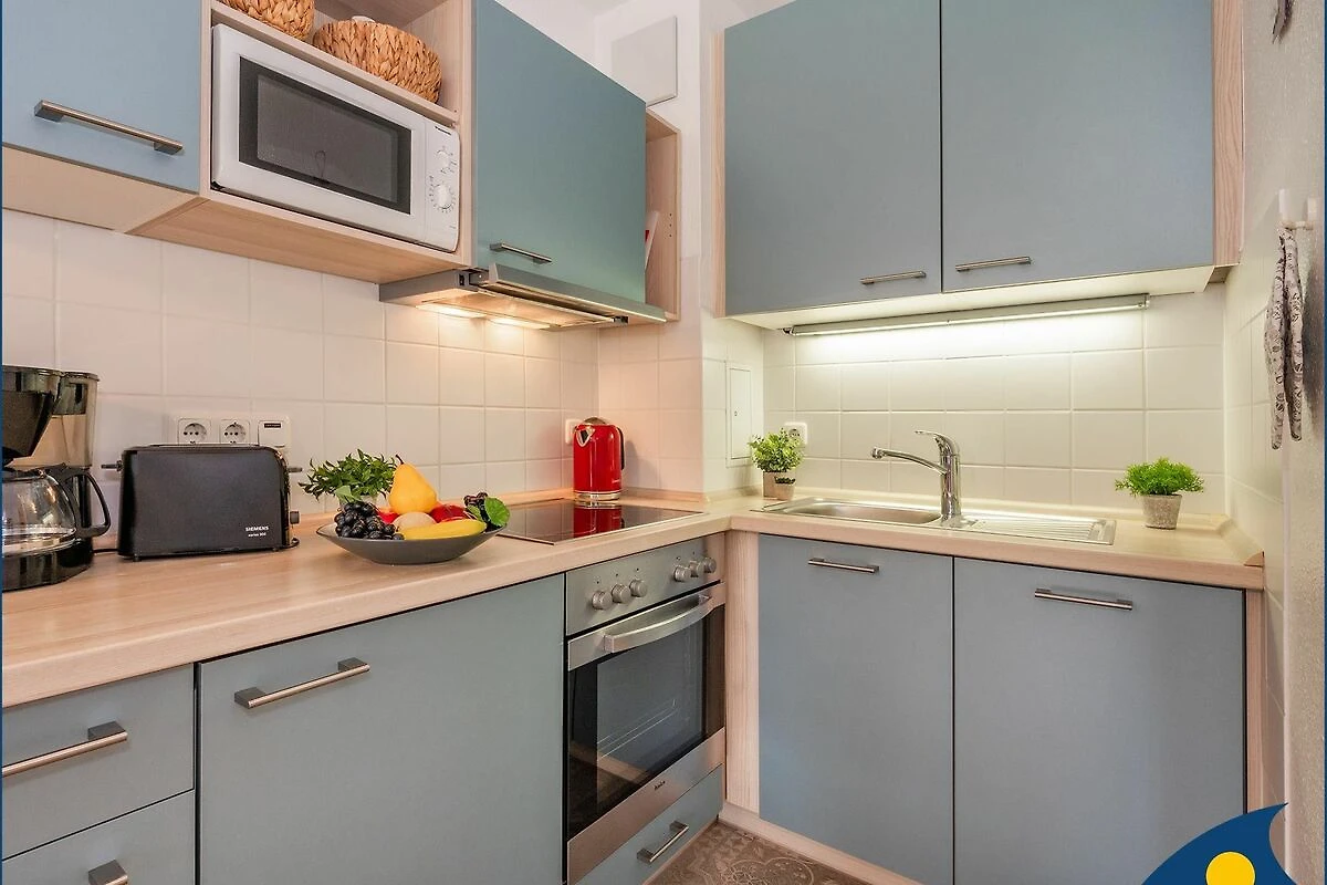 Die Einrichtung ist hell und freundlich gestaltet. Die moderne Küchenzeile beinhaltet alles was Sie für die Selbstverpflegung benötigen (E-Herd, Backofen, Geschirrspüler, Kühl-Gefrierschrank, Mikrowelle, Toaster, Kaffeemaschine und Wasserkocher).