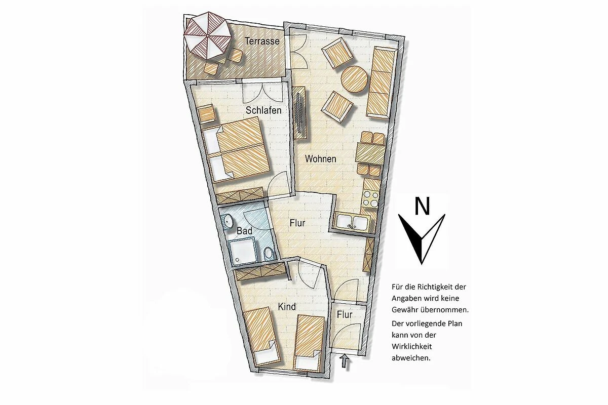 Durch die grosszügigen Fenster hat sie eine helle Grundstimmung. Es gibt 2 Schlafzimmer, 1 Wohnzimmer mit offener Küche, eine Diele, ein Duschbad (Fön und Vergrösserungsspiegel vorhanden) und eine nach Süden ausgerichtete Terrasse mit unverbautem Blick ins Grüne.