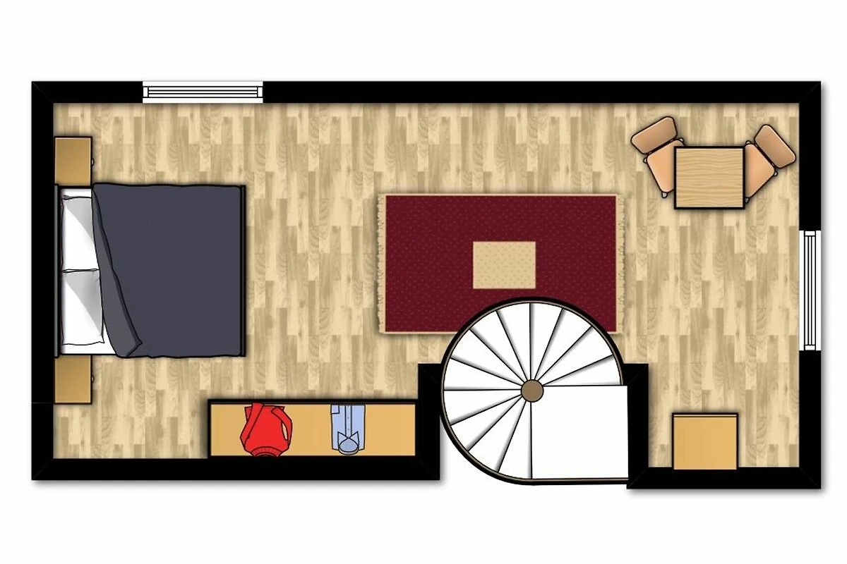 Eine offene Holztreppe führt vom Küchenbereich hinauf in die 2. Wohnebene (DG). Hier ist eine offene Schlafgalerie mit einem bequemem Doppelbett, einer kleinen Sitzecke, Ablagemöglichkeiten und Standspiegel eingerichtet.