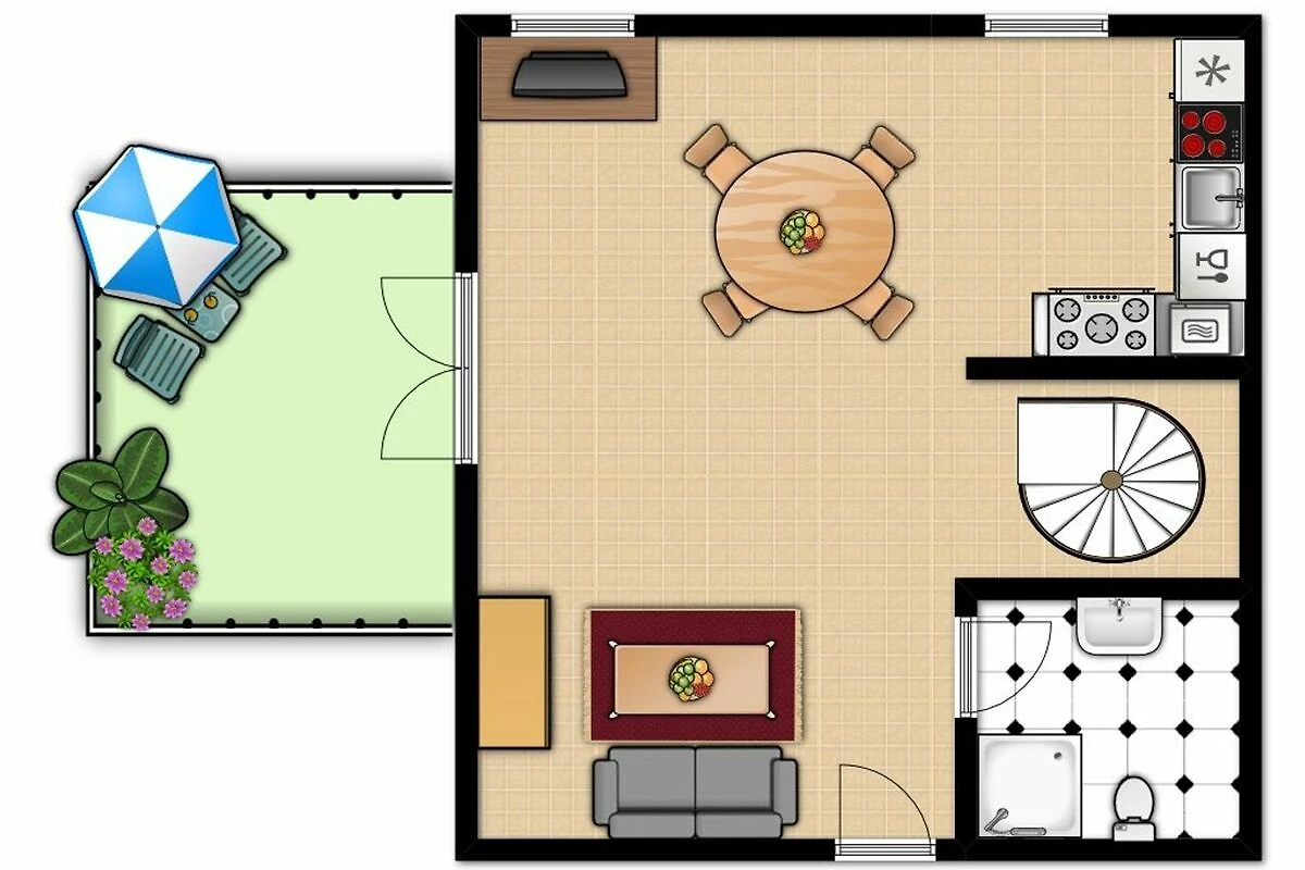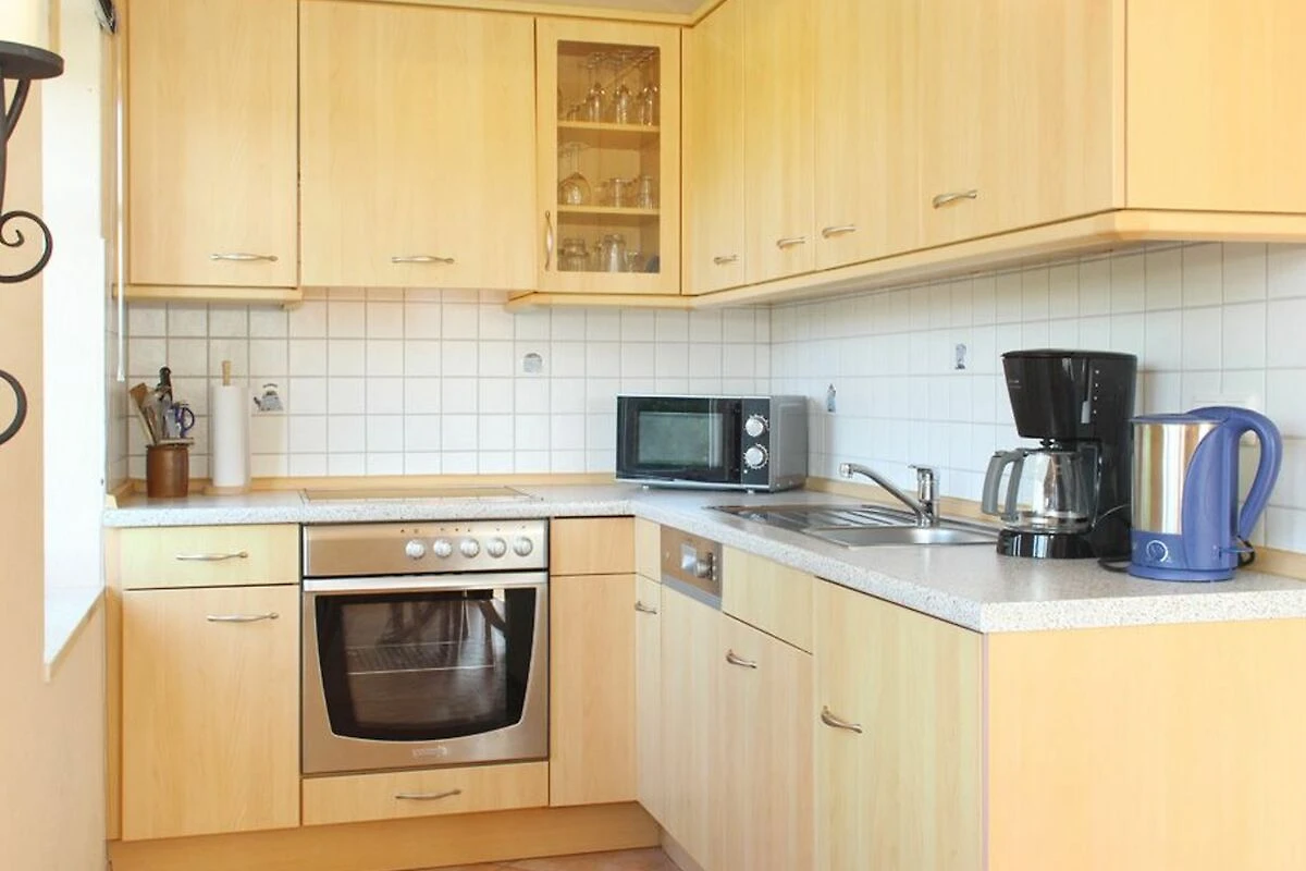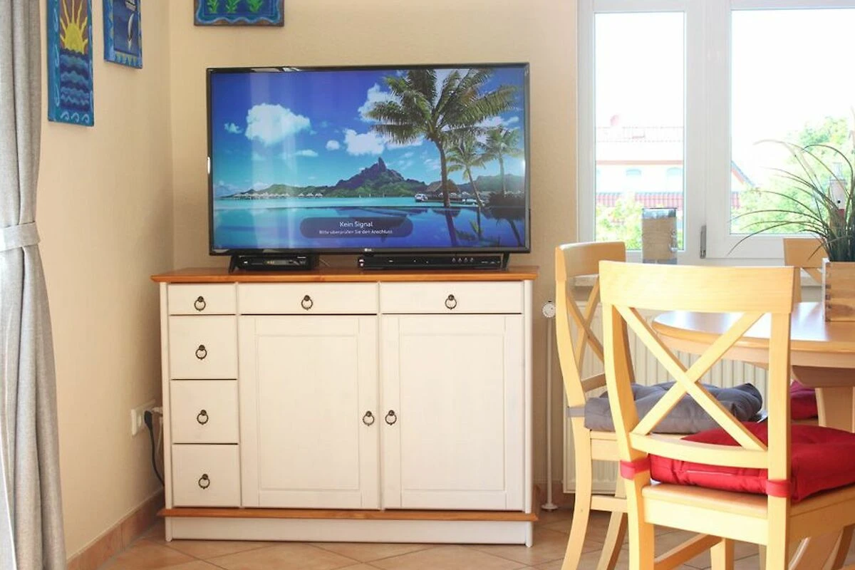Auf der 1. Wohnebene (2.OG) befindet sich der Wohnbereich mit gemütlichem Sofa und Flatscreen-TV (Sat) sowie DVD-Player, an welchem die technisch gut bestückte Küchenecke angrenzt. An der separaten Essecke können Sie gemeinsam Ihre Mahlzeit einnehmen.