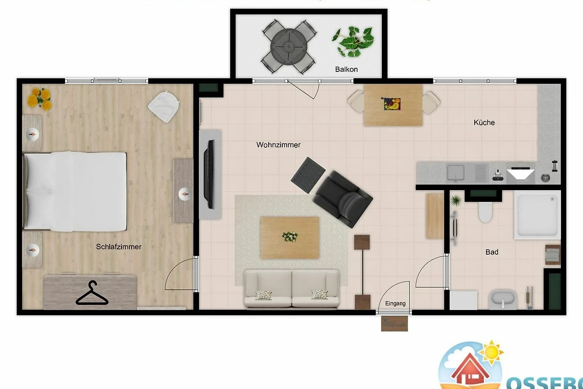 Die Ferienwohnung liegt im 1.OG und ist mit einem Balkon Richtung Süden ausgestattet. Die Wohnung befindet sich ruhig im hinteren Teil des Hauses.