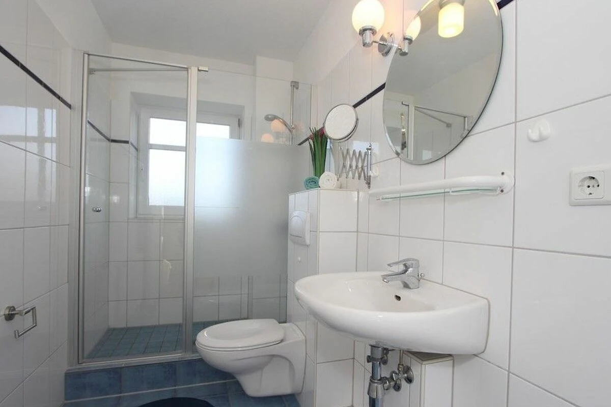 Auch das Bad mit Dusche, WC und Fön befindet sich auf dieser Etage.