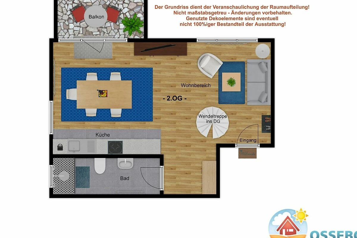 Die Ferienwohnung liegt im 2.OG, erstreckt sich über 2 Ebenen und hat einen Südbalkon. Die Wohnung befindet sich ruhig im hinteren Teil des Hauses.