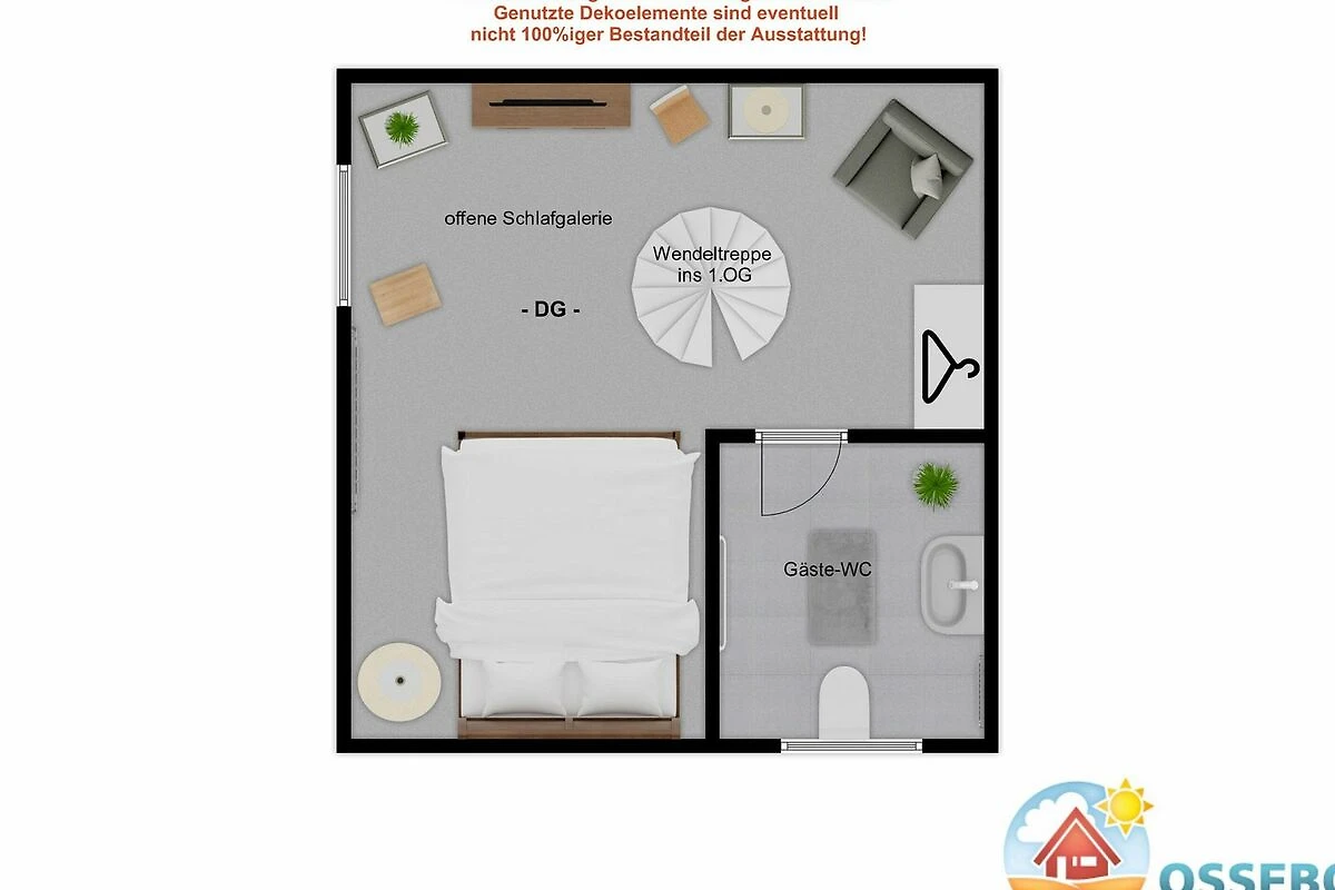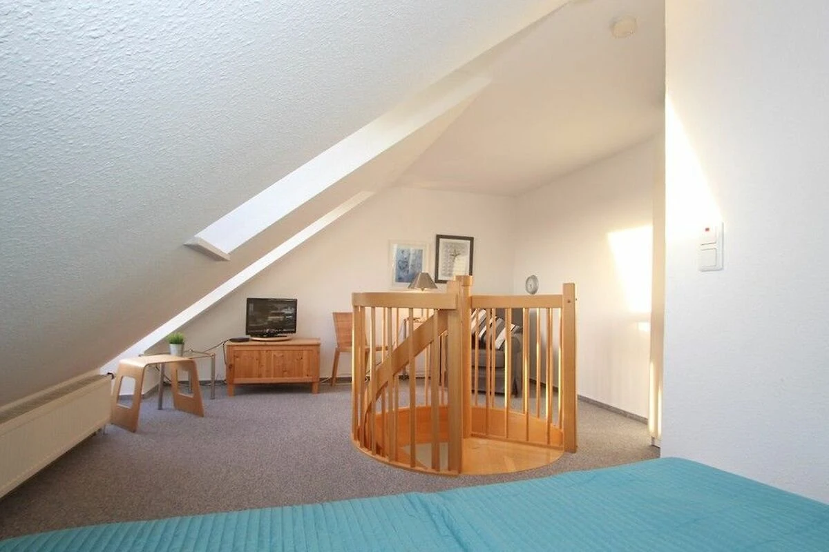 Im Dachgeschoss, der zweiten Ebene, die Sie durch eine Wendeltreppe vom Wohnbereich aus erreichen, ist der offene Schlafbereich mit einem Doppelbett und zweitem SAT-TV (Flatscreen) eingerichtet.